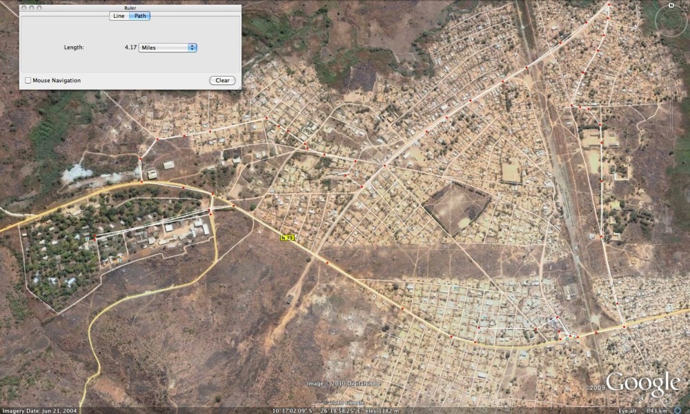 For our first trip, Seb asked one of his staff members who lives in Fungurume to escort us around. So glad Jean-Pierre agreed! We got to see the place up close and personal. We also got some great exercise — 4.17 miles according to Google Earth. The patch with all the green trees on the left is our base camp, Fungurume sprawls to the east, and the red dots show the path we walked. (You can click on the image to make it bigger.)