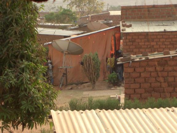 Notice the power lines in the picture above. Jean-Pierre estimates that about 50% of the homes in Fungurume actually have power. His is one of them; he also has a generator and a well in his yard. He told us that his neighbors have asked if they can tap into his resources, but as it is he can barely provide enough power for one TV. Here we are inside his home. The family was home from church, dressed up, and watching a soccer game.