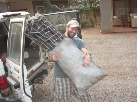 Although it had already been a long day with these two trips into town, we jumped in the truck when we got home and ran out to the small village I mentioned in my last email to buy the charcoal and deliver a print of the family photo. They seemed to remember us and appreciate the photo. Someone new beat them to the top of the hill, though, and gave us an even cheaper price on the charcoal. A Congolese friend that I met in Tucson, of all places, tells me it’s called makala, and that he misses the flavor of meat grilled over it, as well as the awesome bananas from this region. The makala is very very heavy, it turns out — probably 200 pounds. We’ve seen guys on bicycles hauling two and three bundles of this stuff.