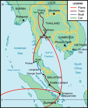 Our itinerary: 1 night in Johannesburg (out of necessity); an overnight flight then 2 nights in Singapore; a long train ride up to Kuala Lumpur then 2 nights there; another long train ride up to Butterworth, a quick ferry to the island of Penang, then 2 nights in Georgetown; a ferry to the island of Langkawi then 4 nights in the rain forest; a long ferry ride + bus + long-tail boat to a beach resort in Railay for 3 nights; a ferry across the bay to a seaside resort north of Phuket for another 3 nights; a short flight to Bangkok then 2 nights there; a 2-night cruise up the Ayutthaya river and back; an overnight train to Chiang Mai; a 2-night eco-tour in the northern hill tribes; 2 nights in Chiang Mai; and finally 5 back-to-back flights to get back home.
