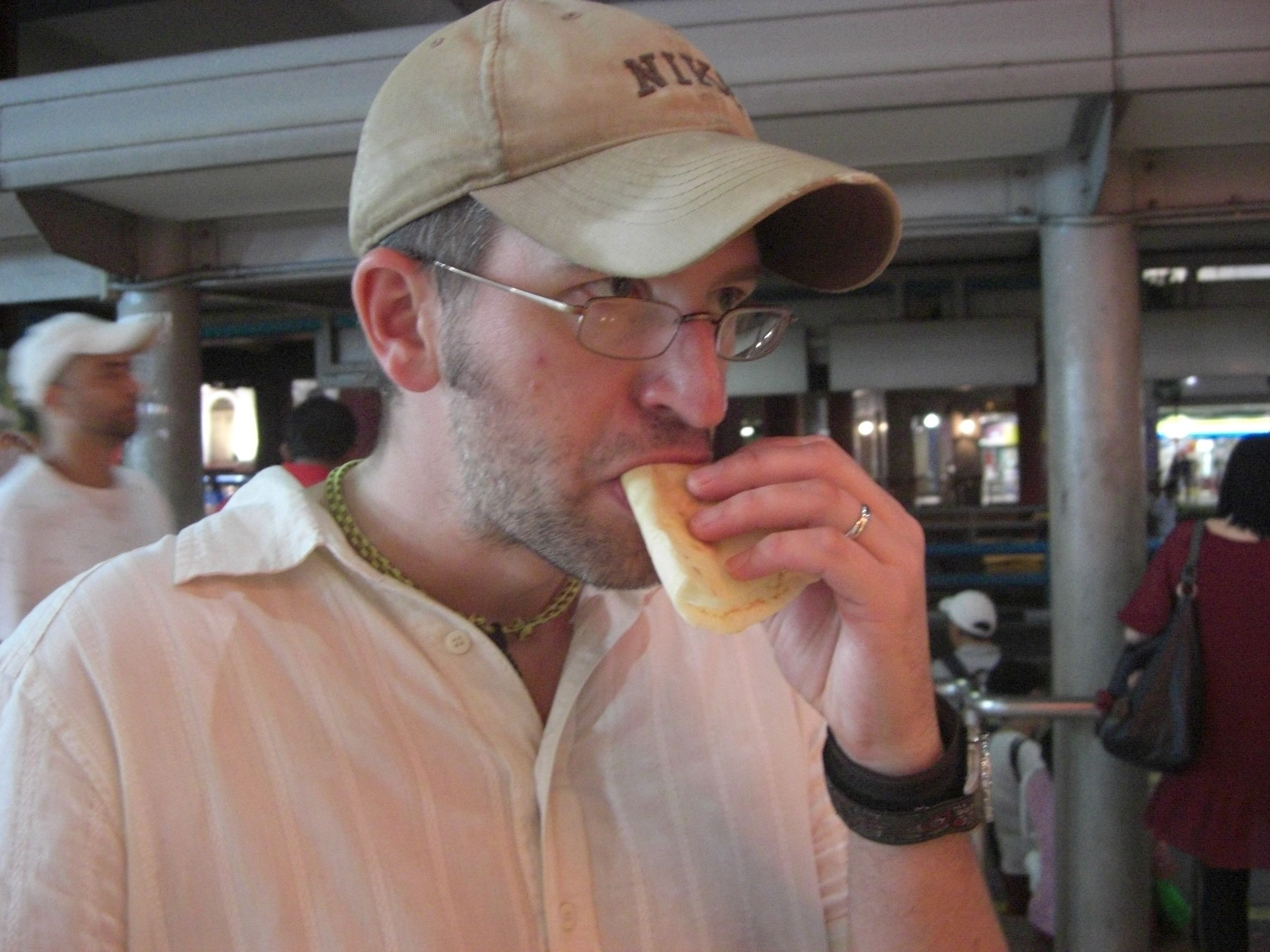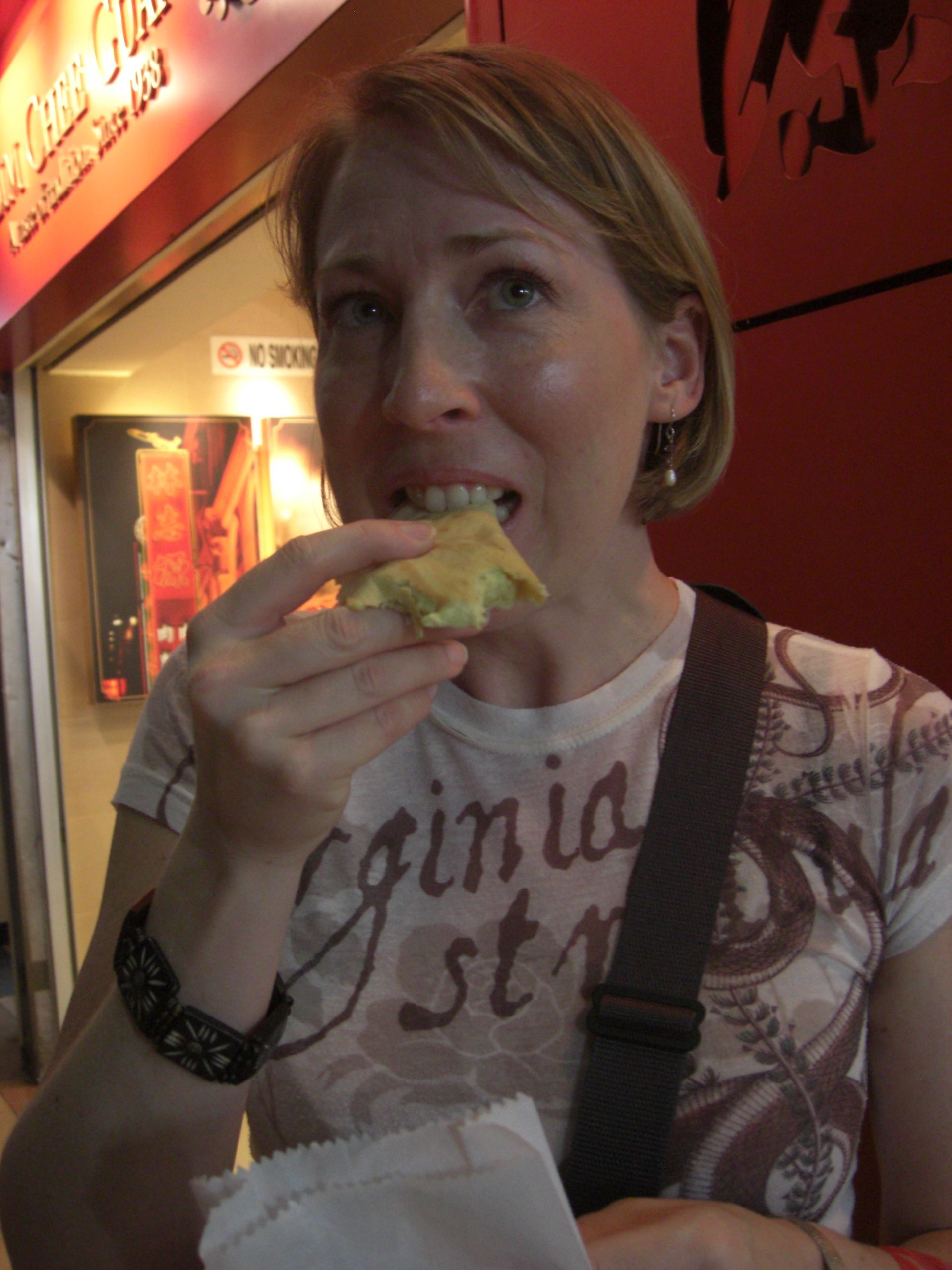 At a kiosk inside one of the malls, we had a chance to sample durian. Durian is a notoriously stinky fruit in Southeast Asia. Apparently it’s so stinky, it’s outlawed from many public places. Some say it smells like poo. So, of course we’ve been on the lookout for it! Here, we’re cheating a little bit. This is chilled durian fruit in a crepe. The smell wasn’t strong because it was chilled, and the taste wasn’t too bad — kind of oniony — though I have to admit, I didn’t really want to finish it.