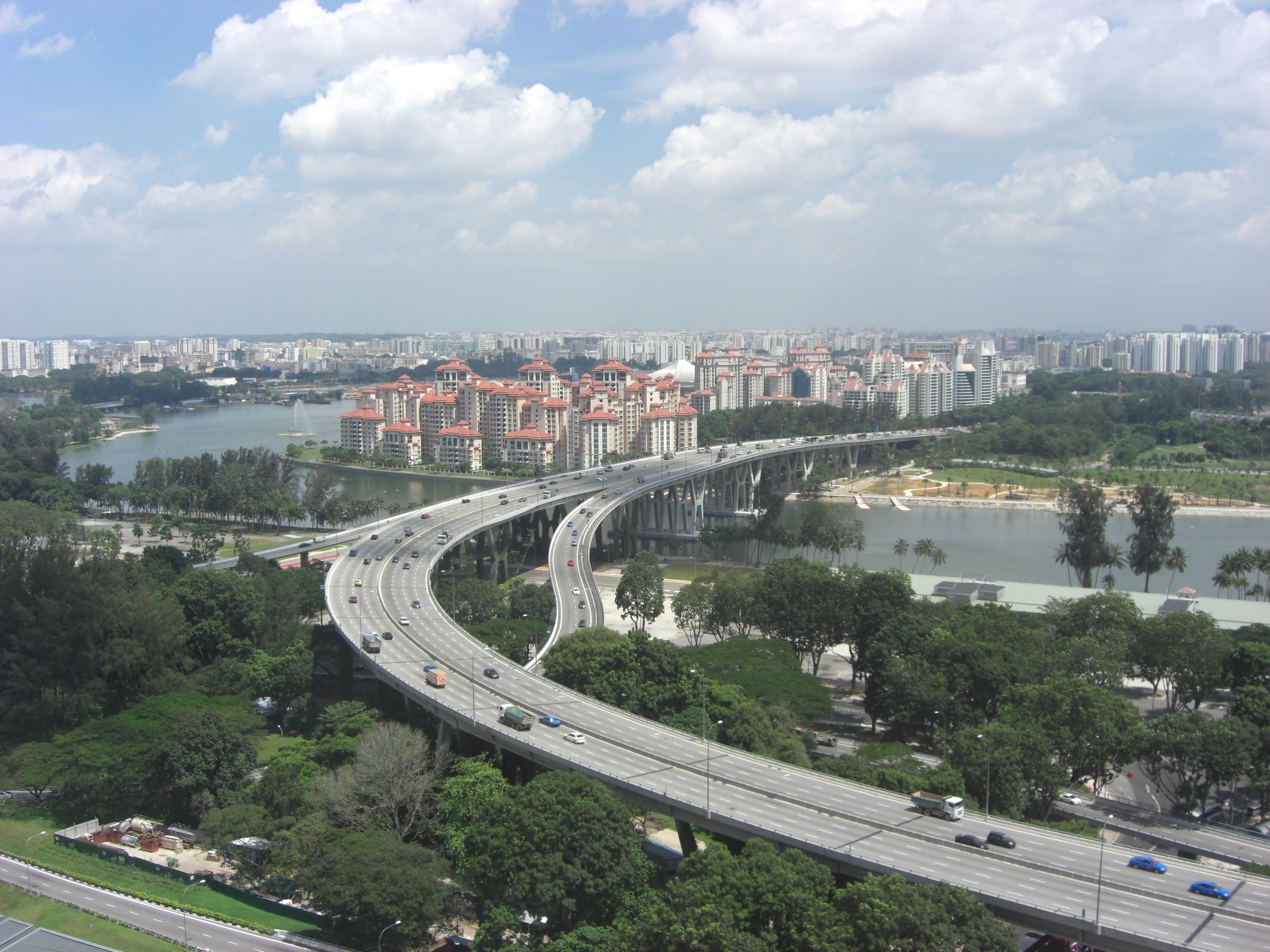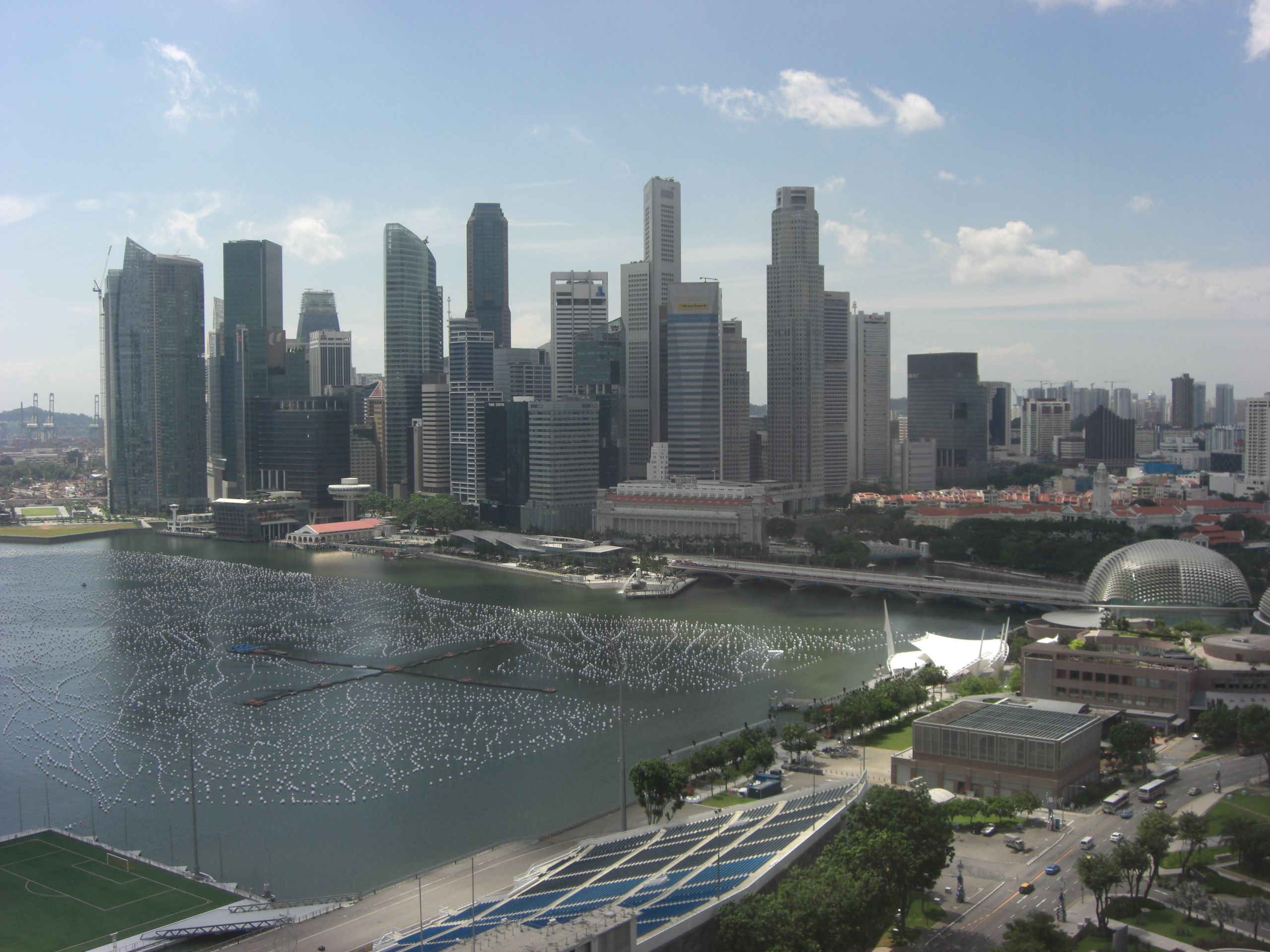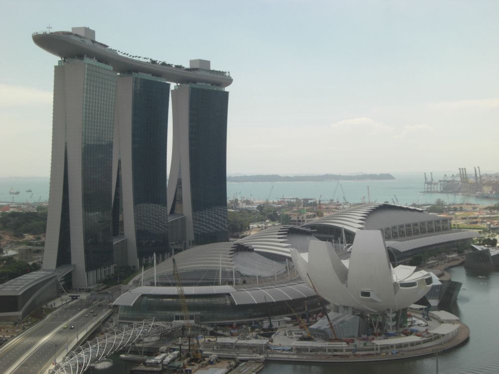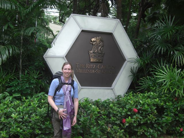 After landing at 5:50am, we took a rather long sleep-inducing subway from the airport to the neighborhood of our hotel, the Ritz-Carlton Millenia. At the exit, a sign indicated the hotel was to the left, so left we went. Several blocks later we concluded there was no hotel that direction. We backtracked, checked the sign again, shook our heads and headed straight for awhile to see what might be there. Way ahead of us was an imposing structure that certainly looked like a hotel (it turned out to be the Marina Bay Sands, a Vegas-style resort that opened just a few months prior), and to our right was a relatively small, unmarked building. I tried a few doors but could not get in nor identify it. At the next intersection, even though we thought our best chances lay straight ahead, for some reason we turned right. A block later we found the entrance to the Ritz, the same bloody unmarked building. It was smack-dab right in front of the subway station, but without any doors or signs on that side. In fact, the best way to get there was turn right and go through a couple shopping malls. Annoying.