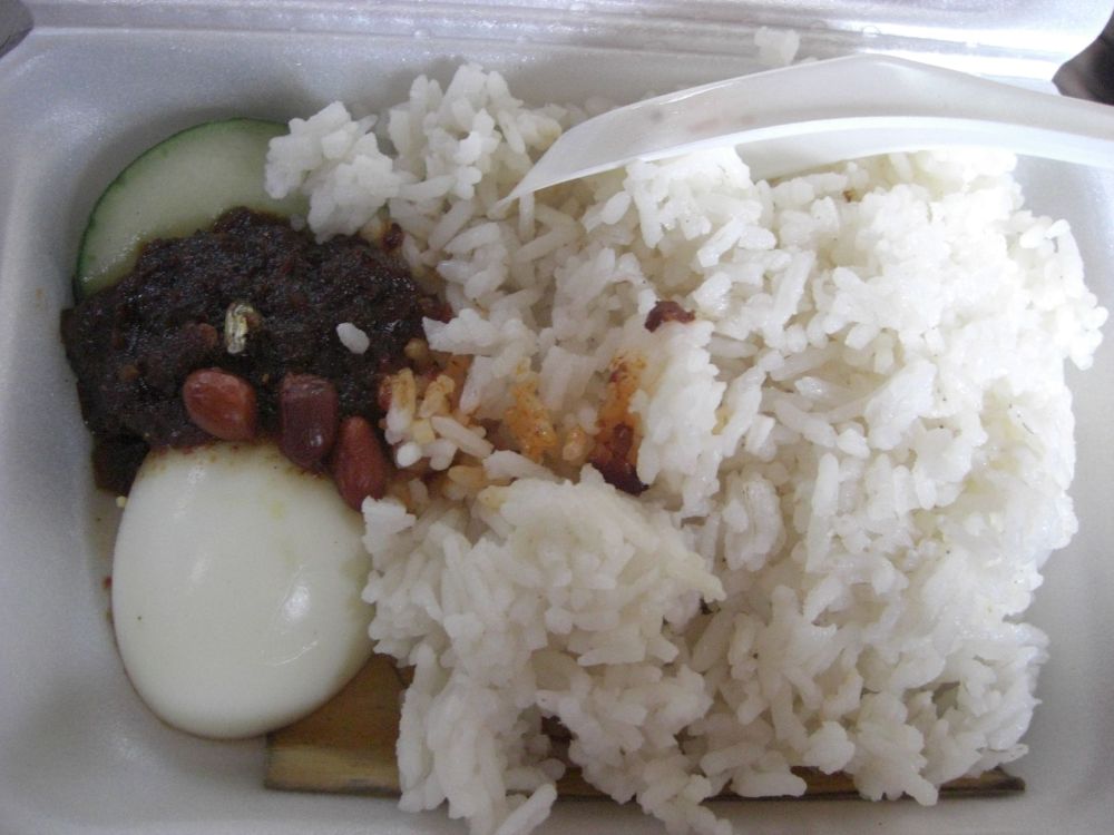 The highlight, in my opinion, was this unassuming little breakfast. The cart attendant offered us Western-style bags of chips or snacks from the bottom of the cart, skipping over these closed styrofoam containers. I asked what those were, and the attendant seemed surprised when we took two. We loved them! Banana leaf on the bottom, rice, cucumber, hard-boiled egg, and a delicious spicy sauce with peanuts and tiny dried sardines.
