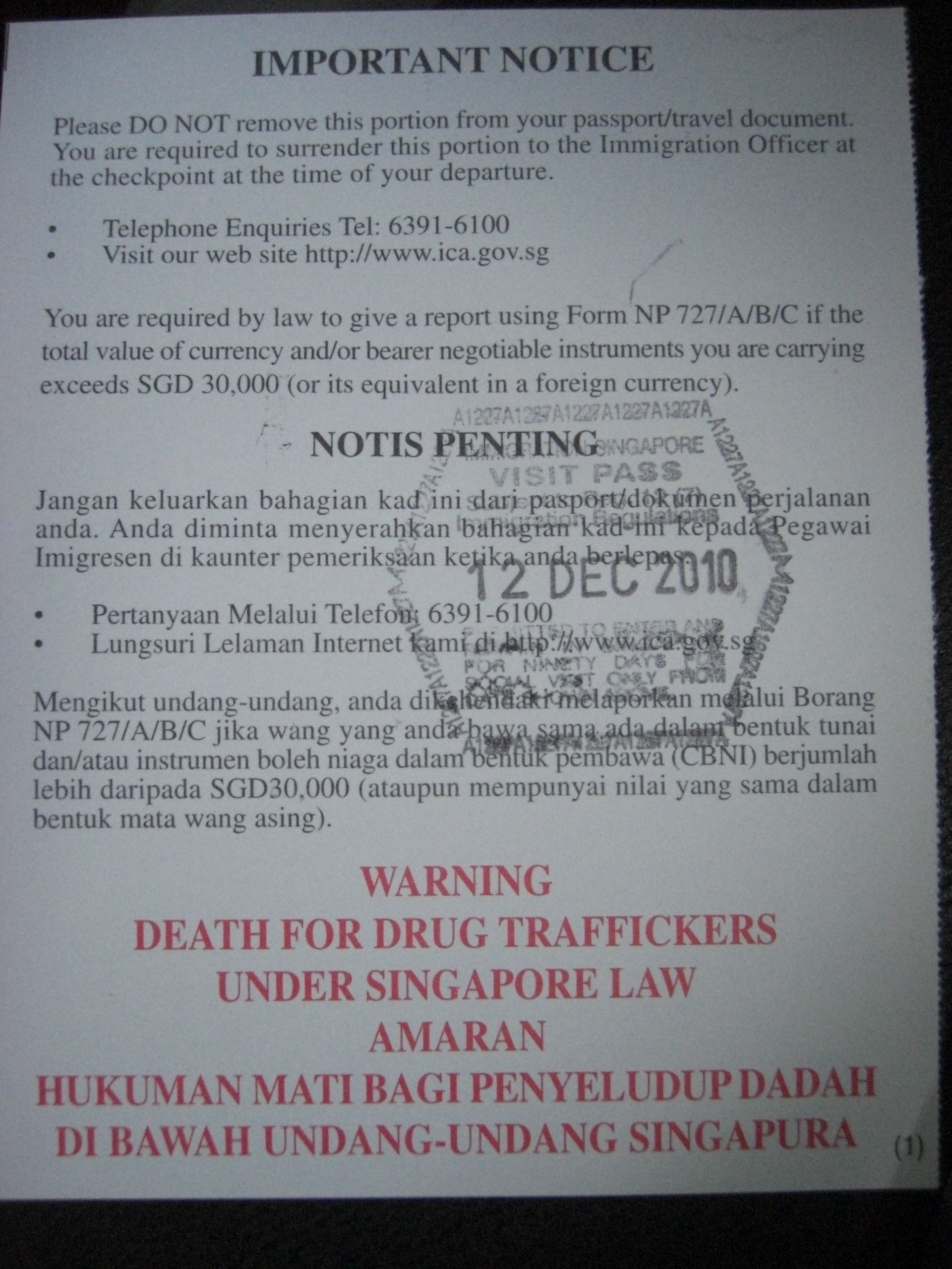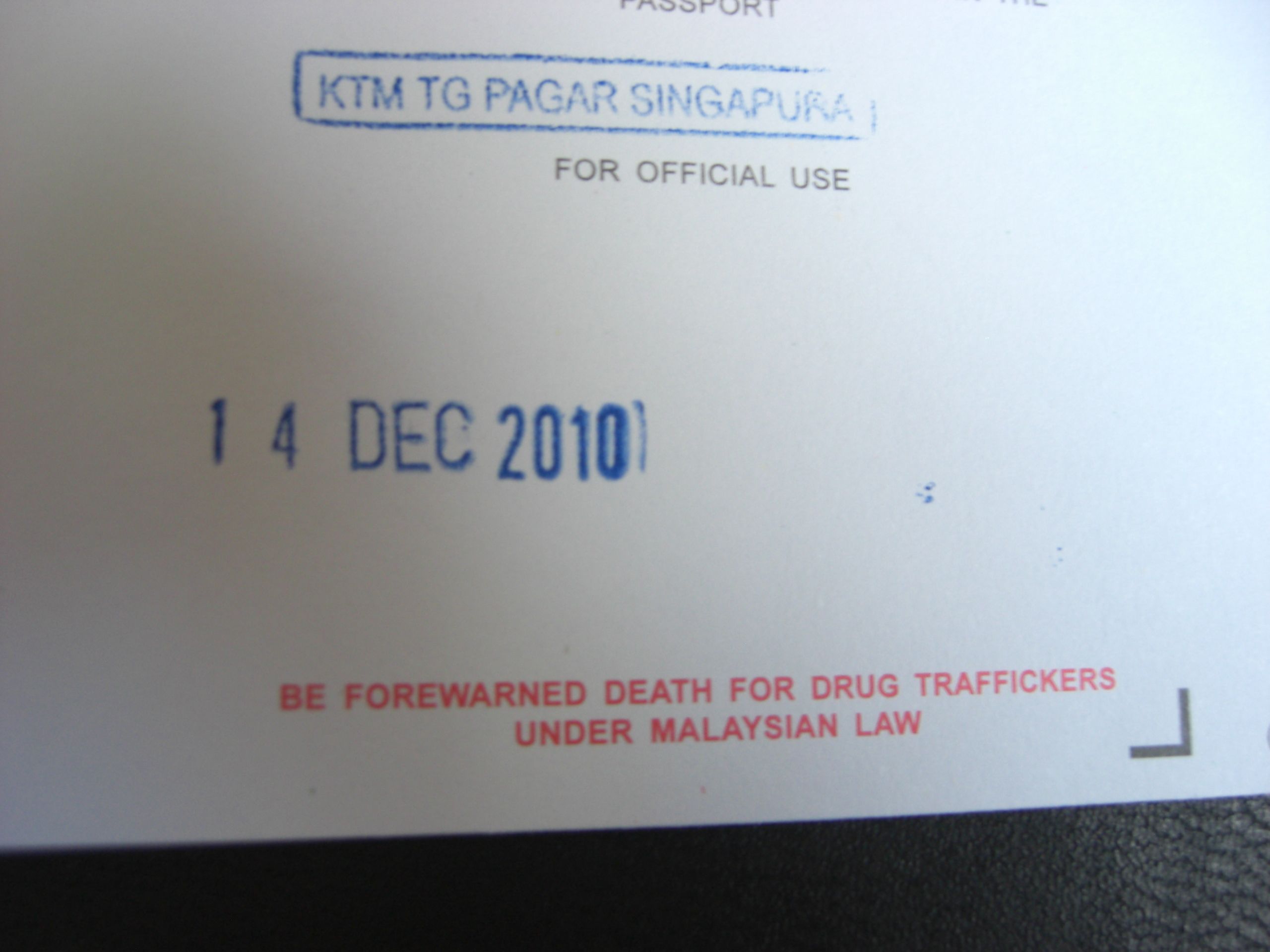 I’d heard from a friend about how the Malaysian drug laws are indeed very strict – she was actually very worried about you traveling there (not that you are a trafficker, but what if they mistake prescriptions for illegal drugs?). She had another friend who traveled there from the US. One of the passengers from their flight was pulled aside by the police in the baggage claim area after disembarking. They found him hanging in the public square a day or two later. No second chances or long legal process for violaters!