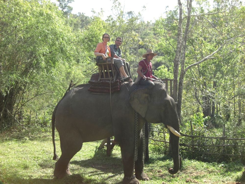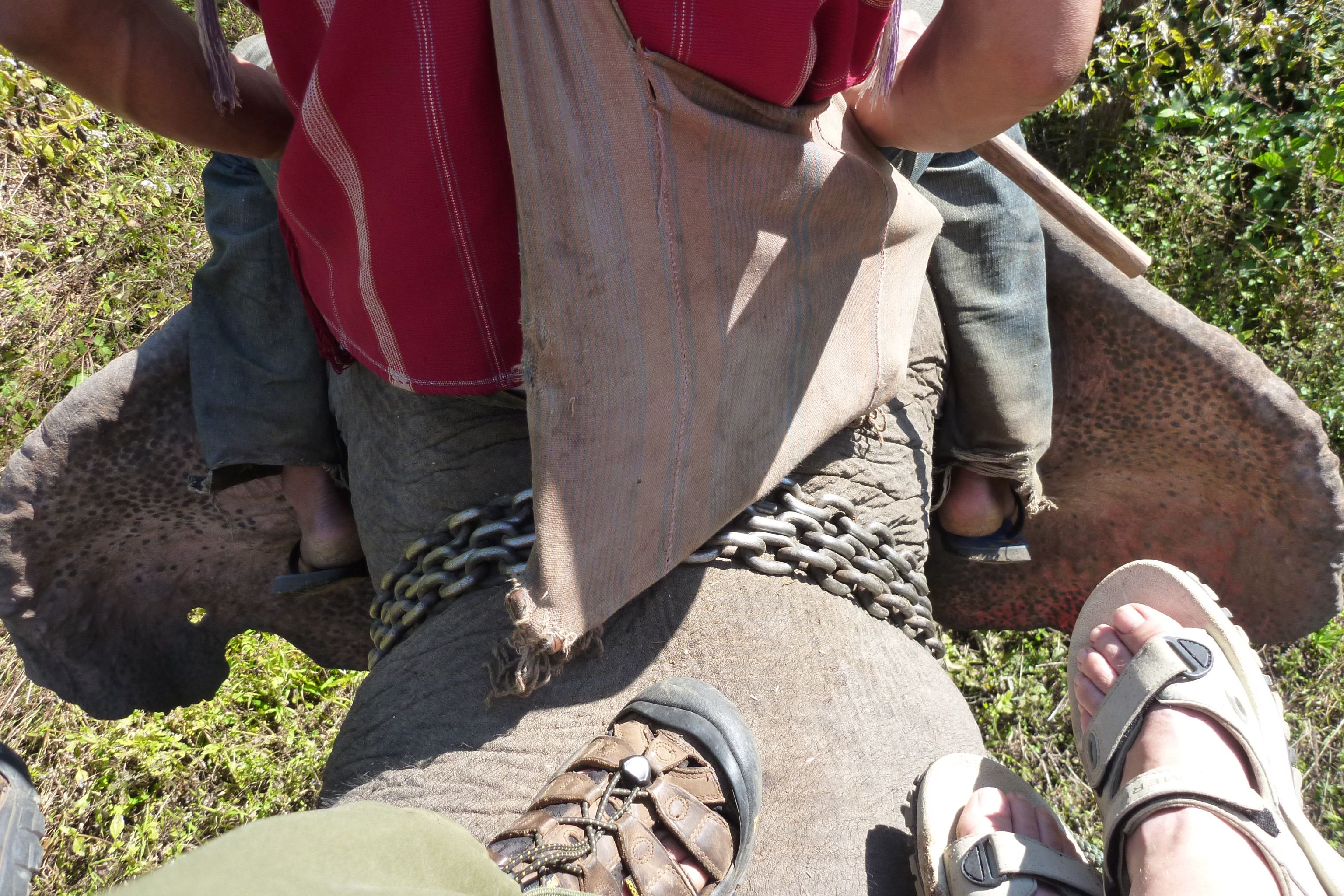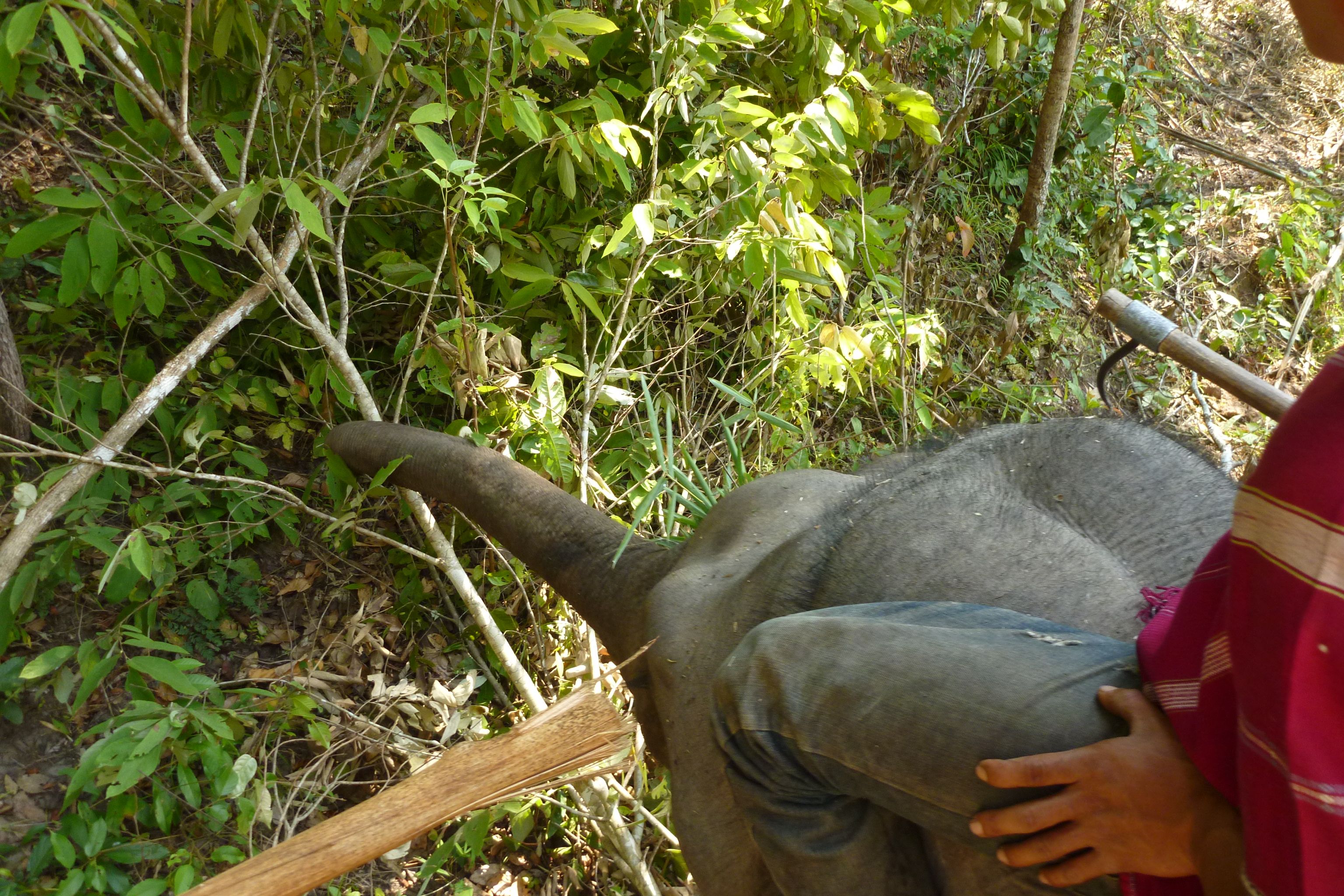 After lunch we head through the forest again with our 2 guides. Soon we come upon a little ranch. There’s an elephant waiting for us!