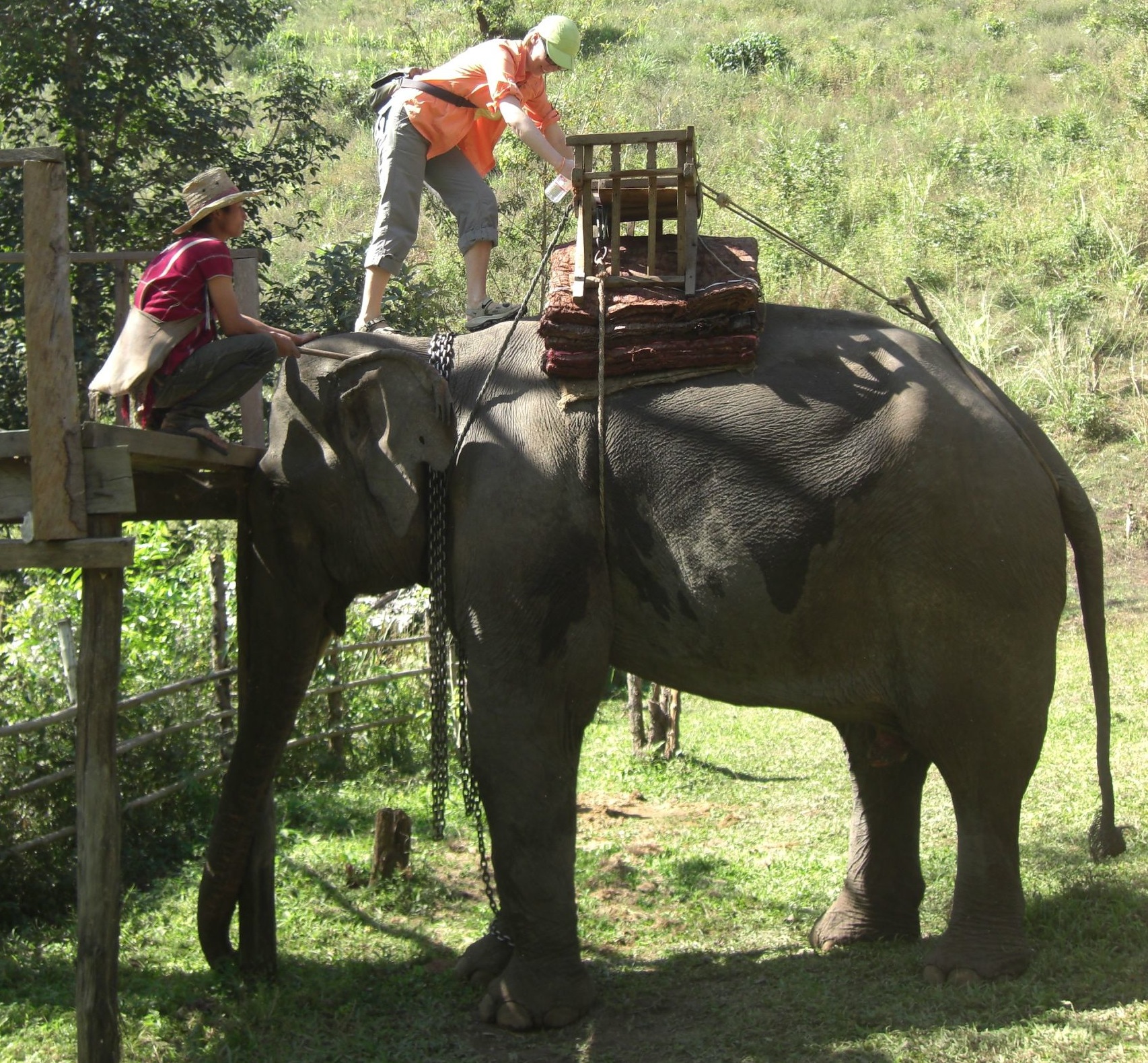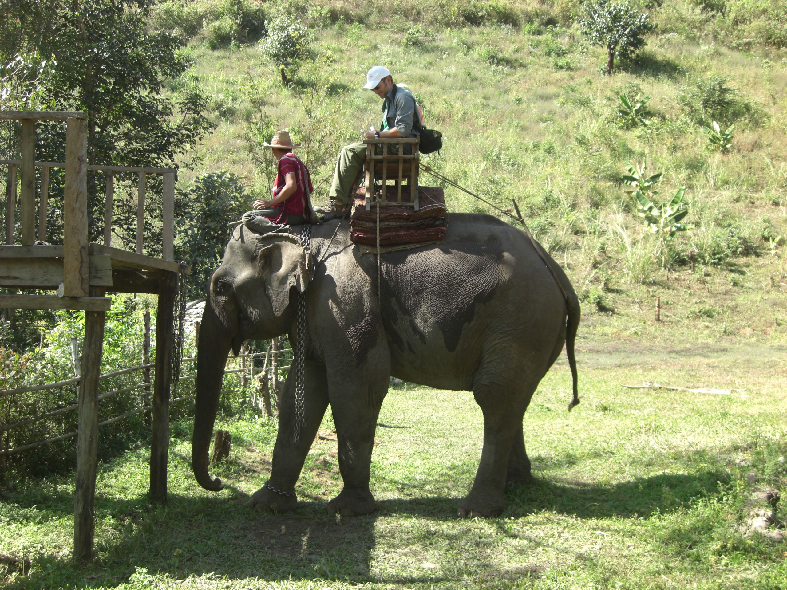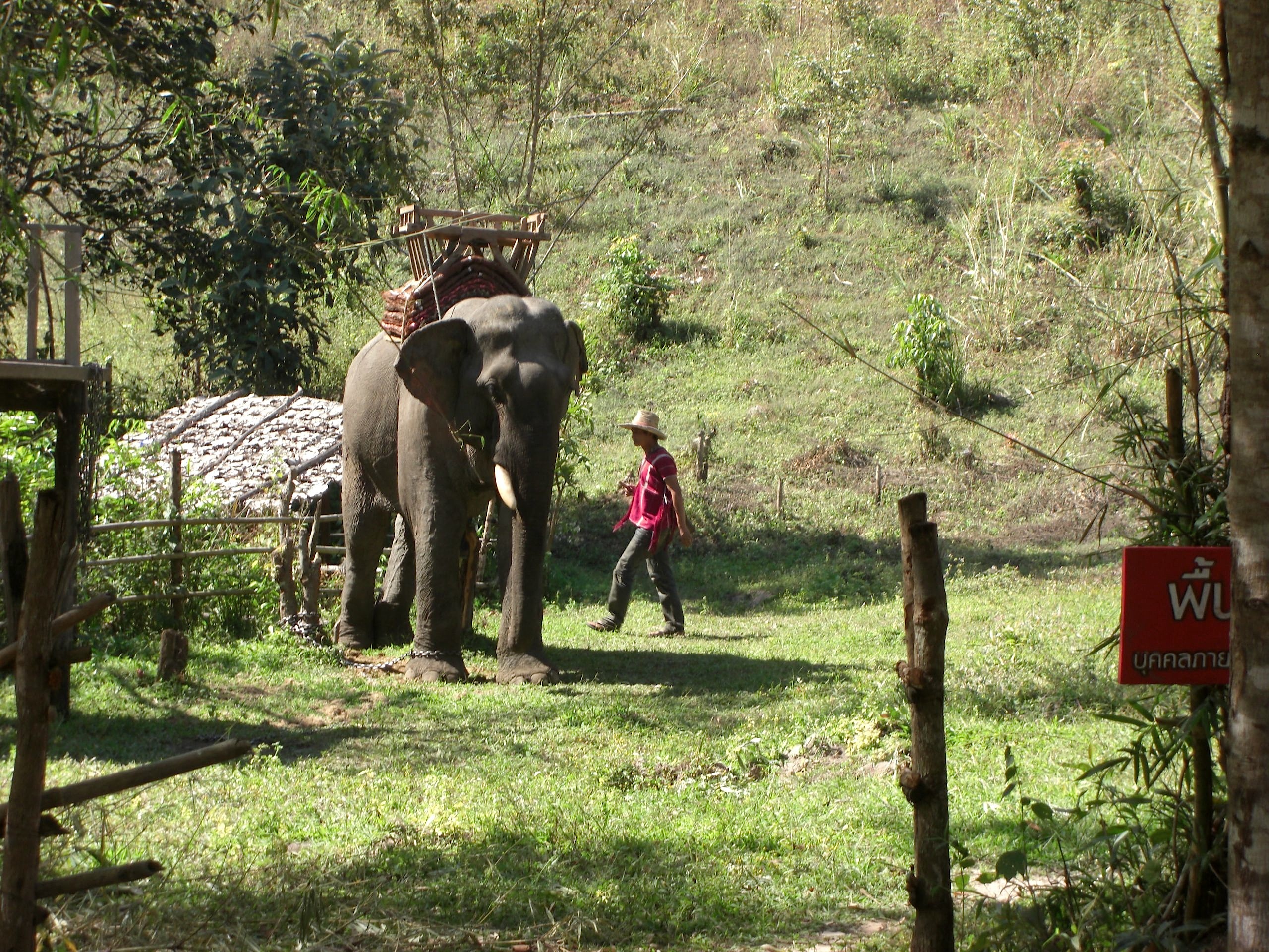 After lunch we head through the forest again with our 2 guides. Soon we come upon a little ranch. There’s an elephant waiting for us!