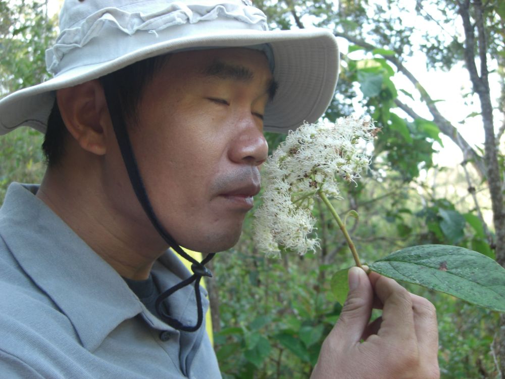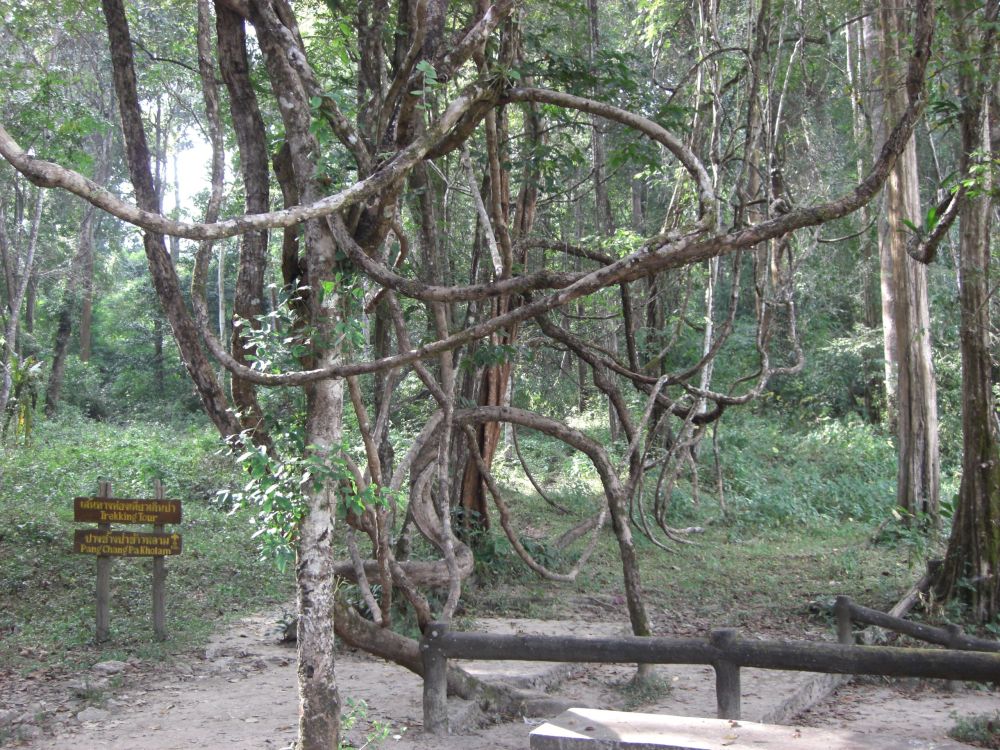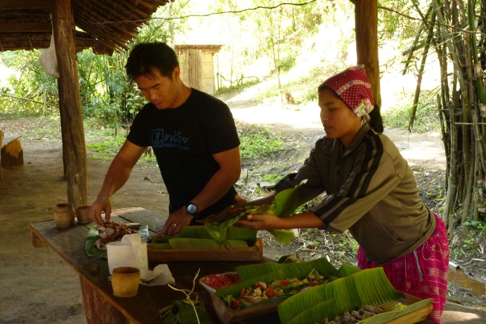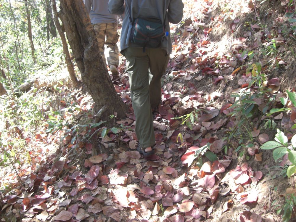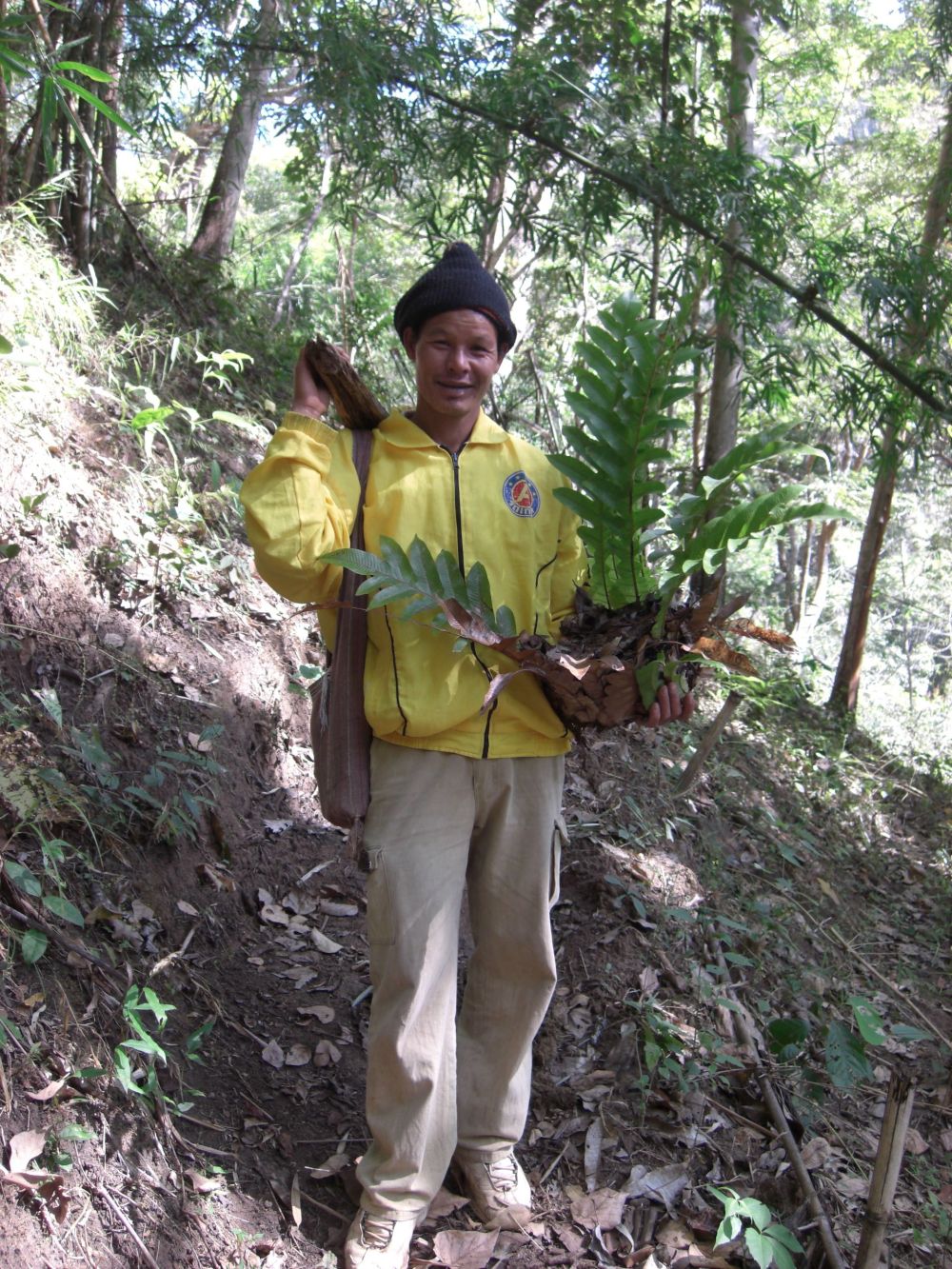 We turn around and see that the local guide, who is bringing up the rear, is carrying a large plant and a piece of wood. We ask Soiphet why he is carrying these, then find out they will be decoration for his home.