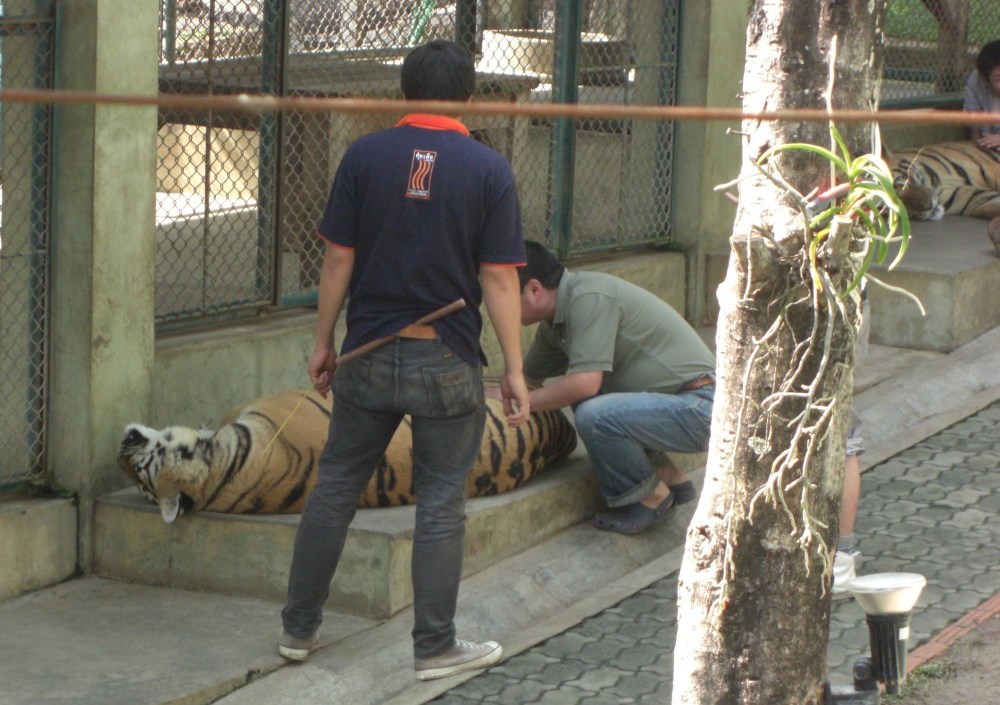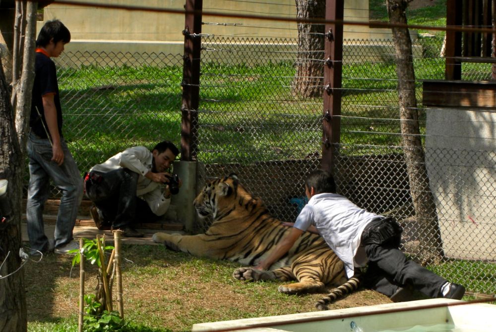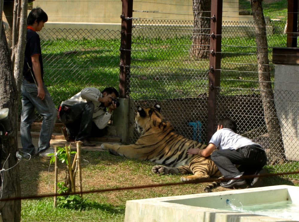 The brochure answers my question. They wake the tigers up during their snooze because, of course, there’s a market for the photographs. “What the customer wants they usually get! It’s the same story in every business in every country!” Oh, and without the customers, the tigers would starve. There’s the food and vet bills, after all.
