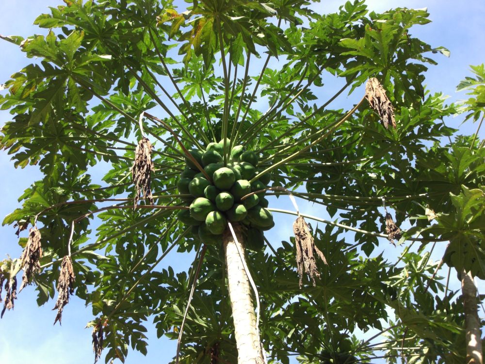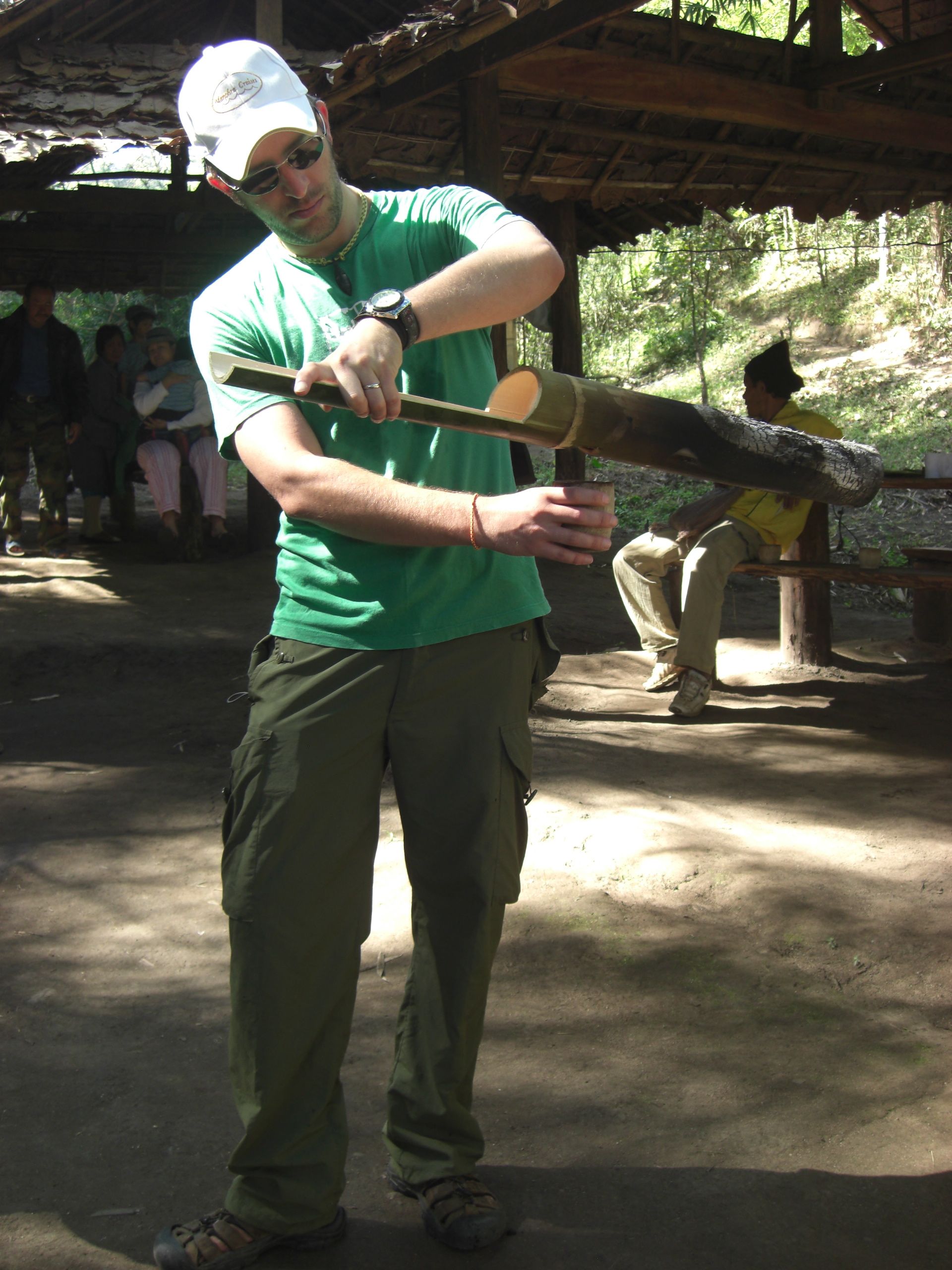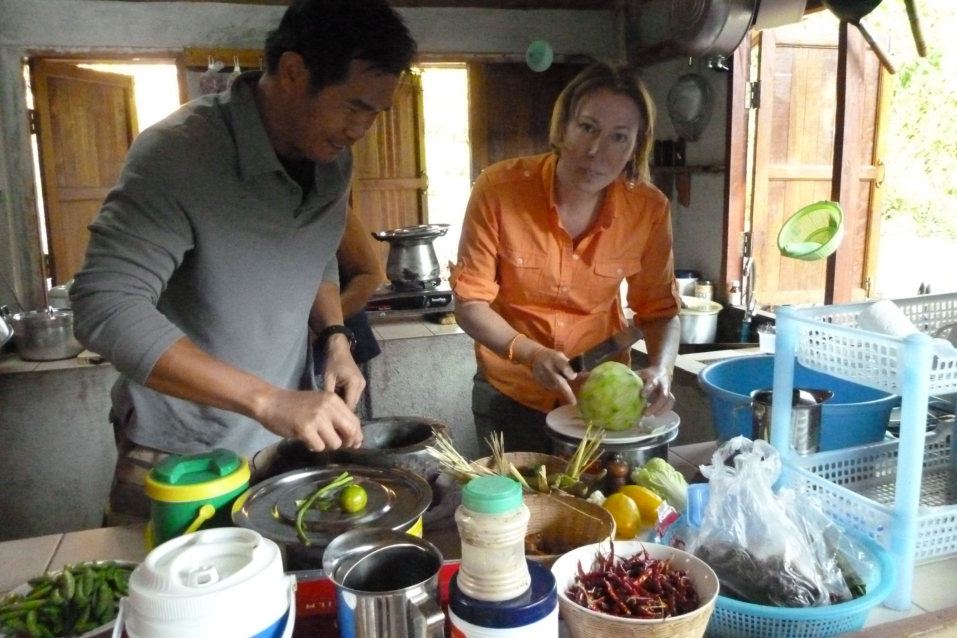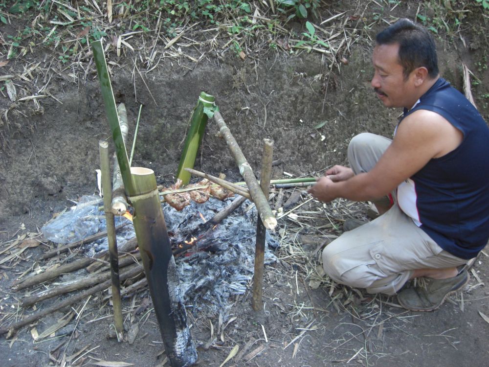 Back at the Lodge, the driver grills his favorite spiced chicken over the fire, and pours us glasses of a strong homemade rice wine. Meanwhile, Soiphet teaches me how to make papaya salad. They hold the papaya in one hand and whack it with a large knife, down and across, to make little julienned strips. He makes it look easy, but I would much prefer a cutting board.