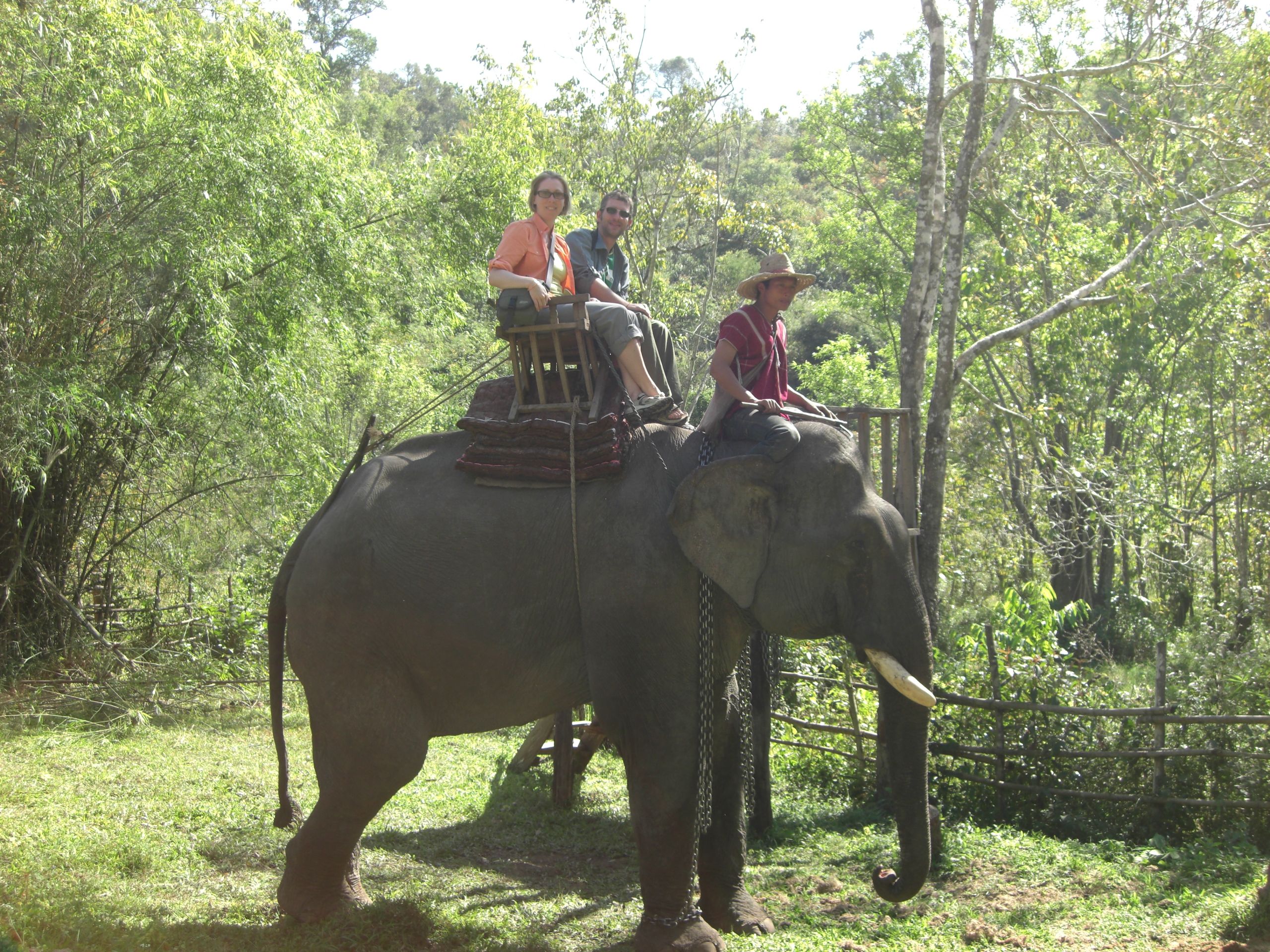 We spend the next hour and a half letting the elephant and 2 mahouts take us through the forest. This felt like a much more natural exercise than the poor dancing elephants at Ayutthaya. This guy chomped on trees the entire time! The mahout would grow impatient after a few minutes, getting the elephant to move again after bouncing on his neck a few times and kicking his ears, humming, “Mmmm, mmmm.” Sometimes the elephant would drag an entire tree with him while he walked. At one point we spotted another elephant off in the distance. The mahout pointed at her and said, “Girl.”
