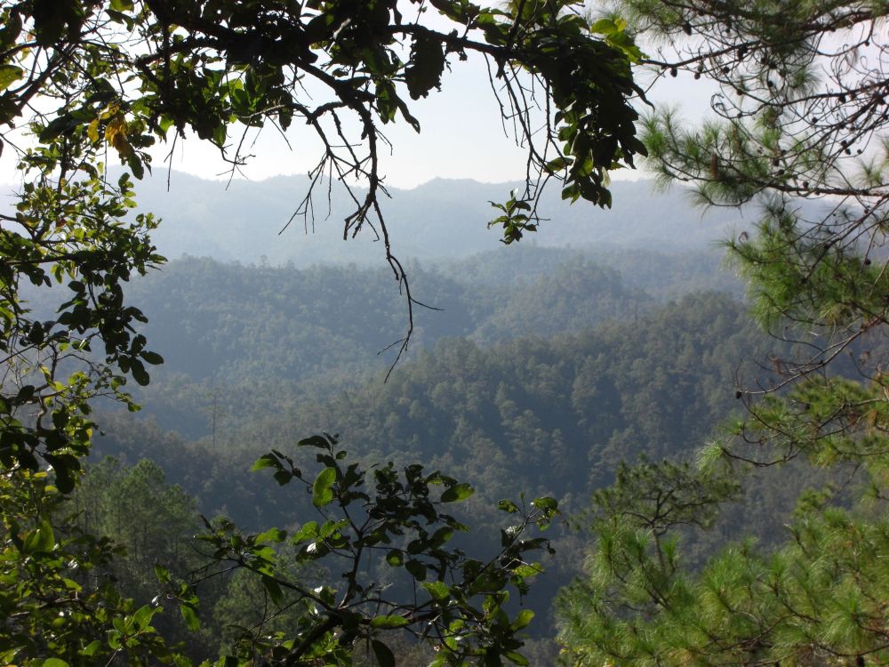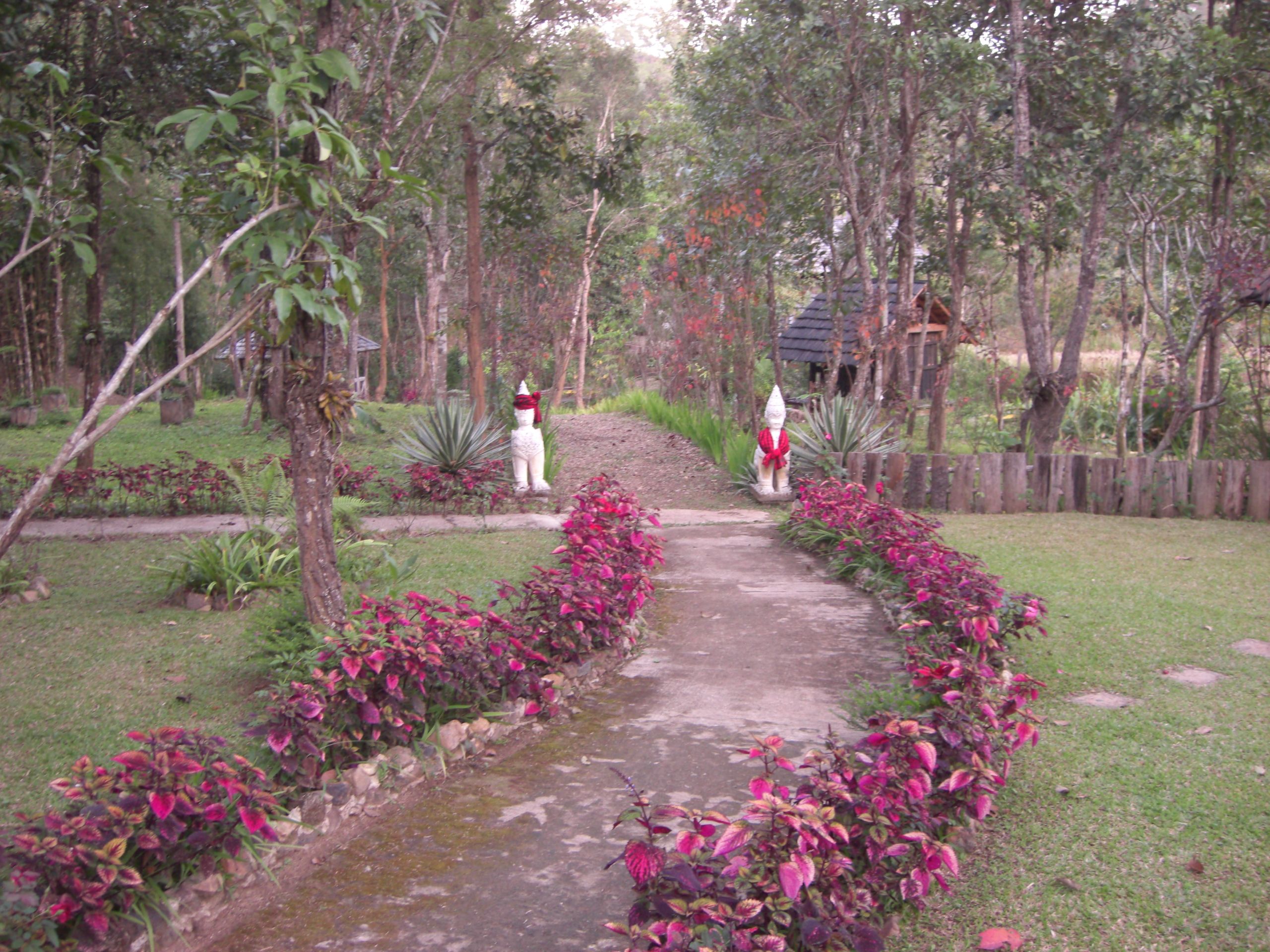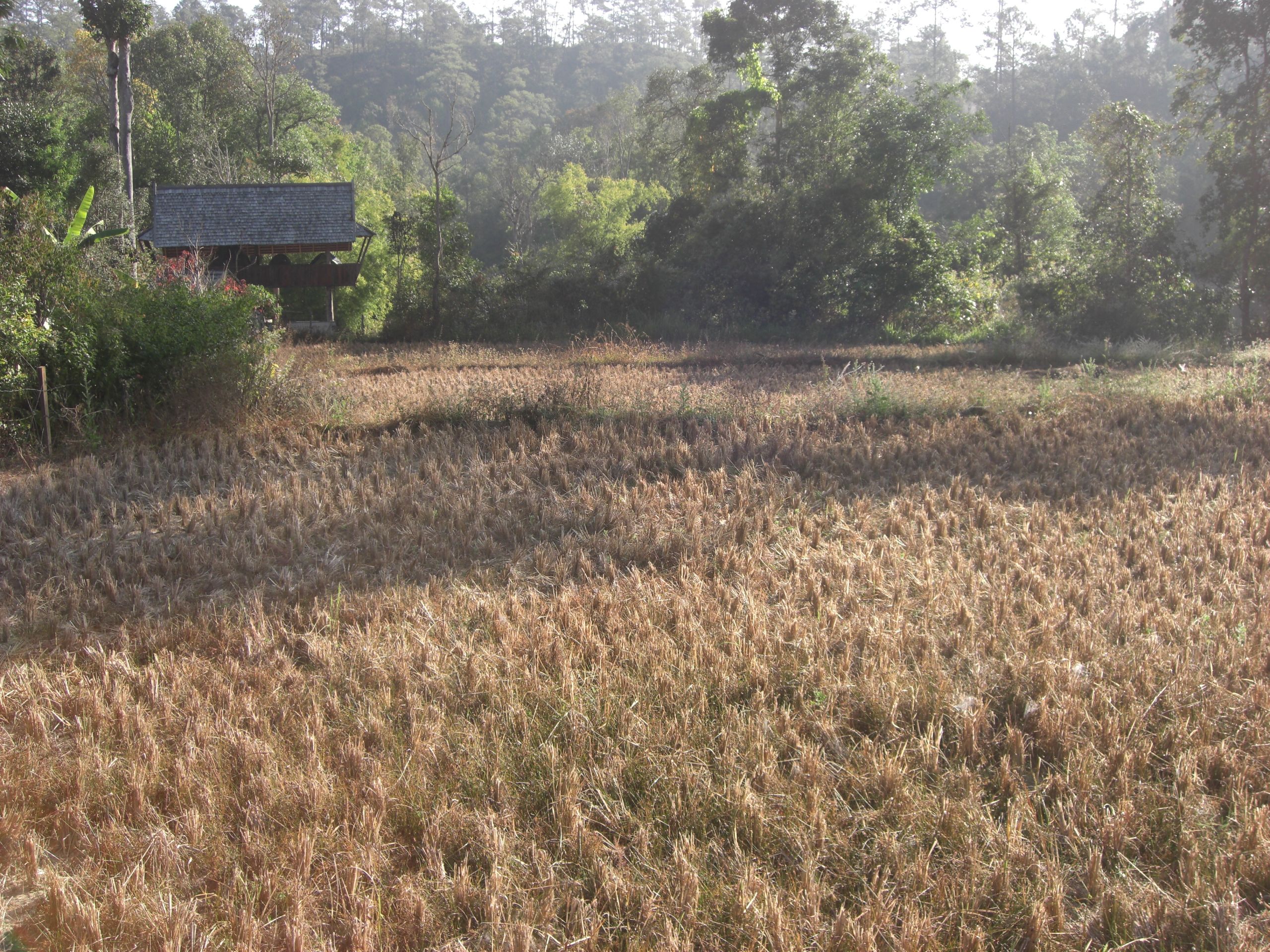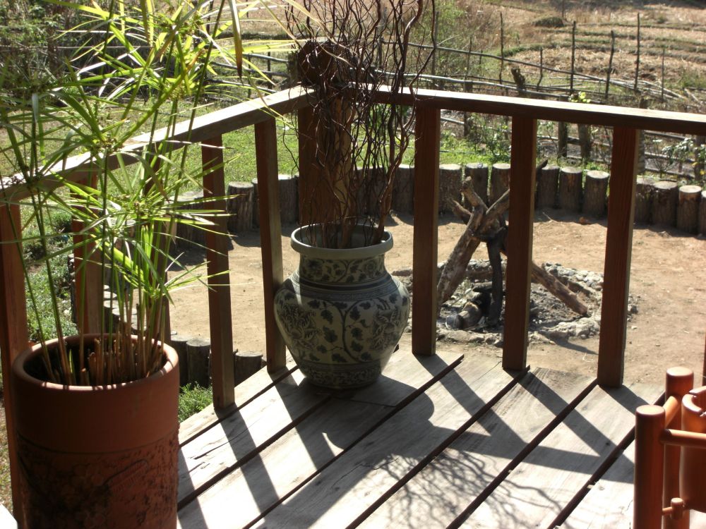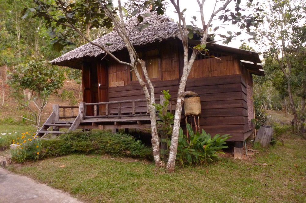 Four and a half hours after leaving Chiang Mai, we arrive at our destination for the night, Le Musikee Eco Lodge. The place is quite pretty, 1000 meters high in pine forests, intersected by 2 rivers. We are the only guests there. We’re told there’s only an hour of electricity left on the generators, so here’s a candle for the room, and bring a flashlight to dinner. The dinner is good; the brochure says everything is organically grown within the resort. We retire to our cottage, the wood slats of the floor at times revealing the ground below. The place smells wonderful, like the pine forest that surrounds us. There are stars everywhere. The only bummer was looking at an unused firepit that the cottages circled. It’s cold – we find out the next day it got down to 7 degrees C, about 45 F. But it feels refreshing. It’s like glorified camping, and I like it a lot.