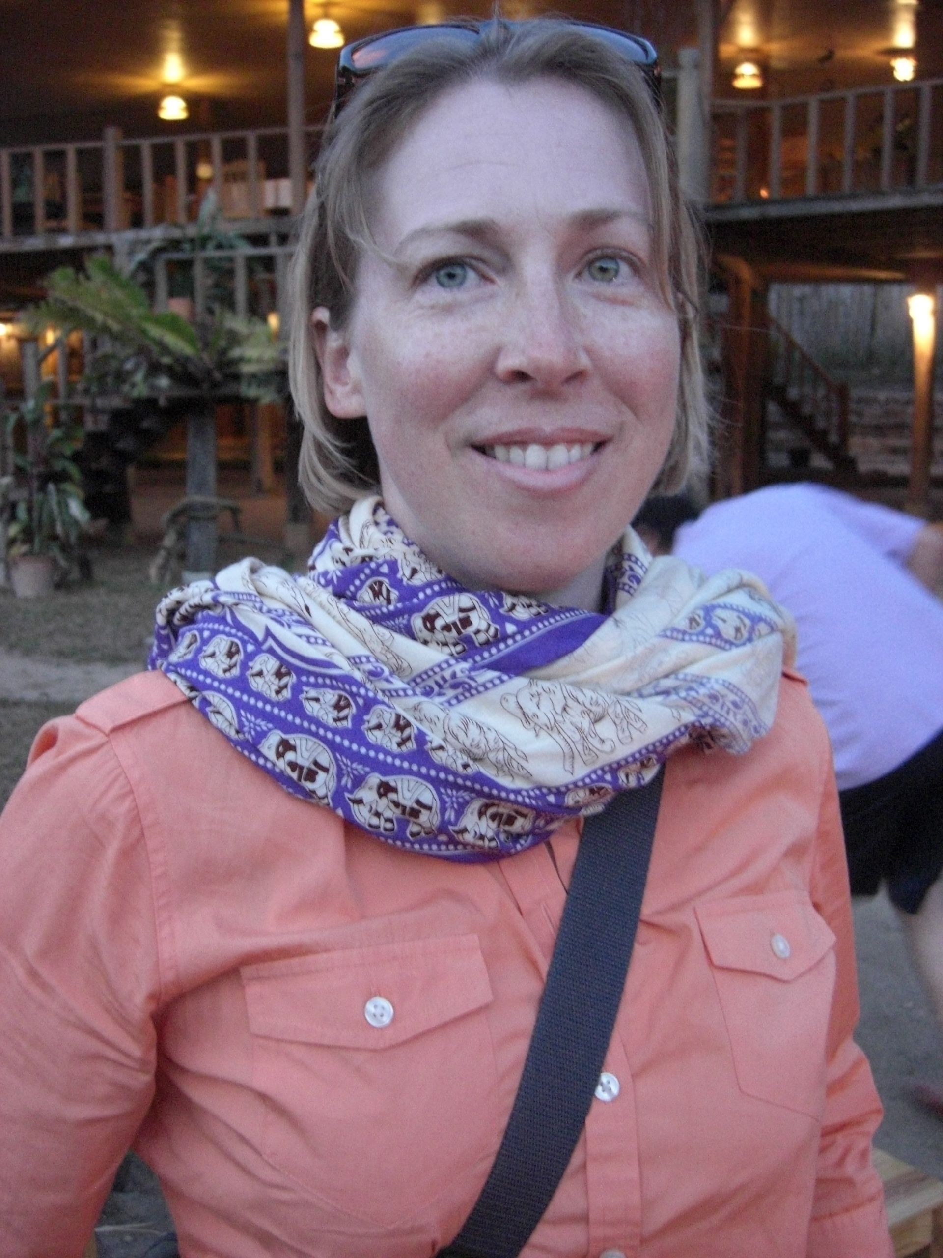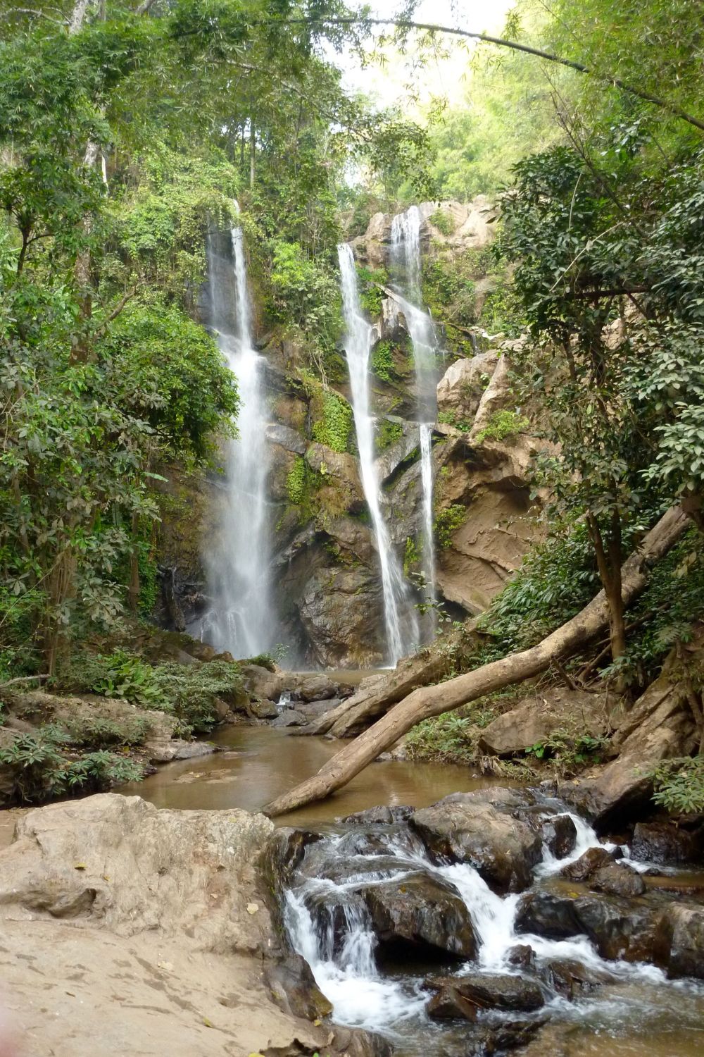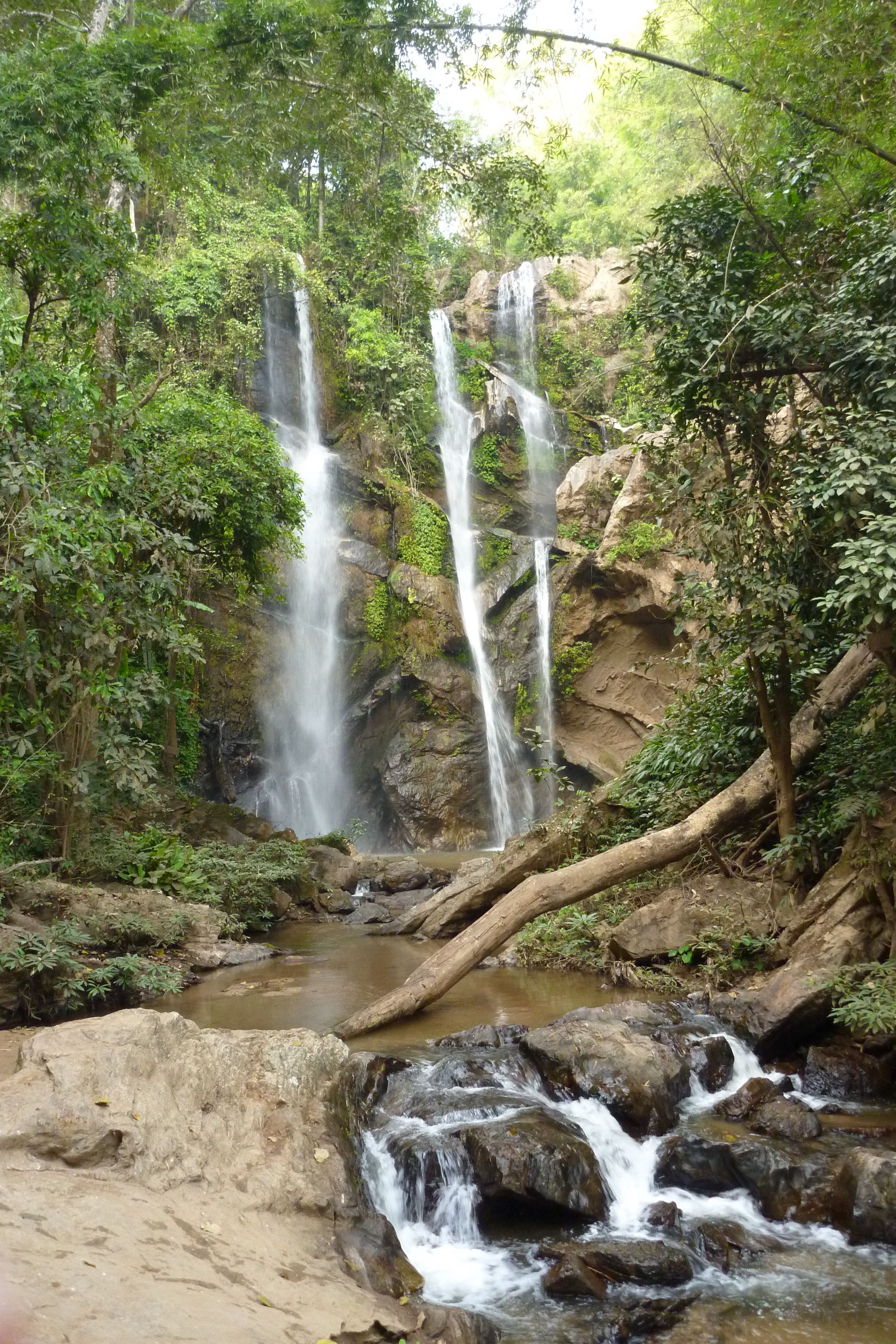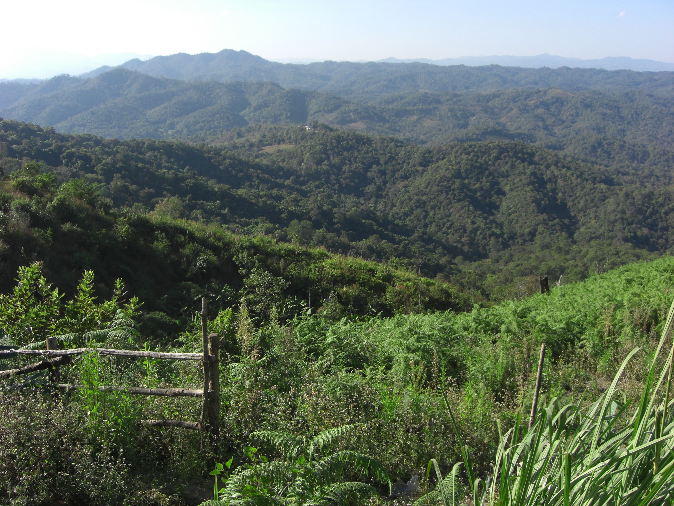 Four and a half hours after leaving Chiang Mai, we arrive at our destination for the night, Le Musikee Eco Lodge. The place is quite pretty, 1000 meters high in pine forests, intersected by 2 rivers. We are the only guests there. We’re told there’s only an hour of electricity left on the generators, so here’s a candle for the room, and bring a flashlight to dinner. The dinner is good; the brochure says everything is organically grown within the resort. We retire to our cottage, the wood slats of the floor at times revealing the ground below. The place smells wonderful, like the pine forest that surrounds us. There are stars everywhere. The only bummer was looking at an unused firepit that the cottages circled. It’s cold – we find out the next day it got down to 7 degrees C, about 45 F. But it feels refreshing. It’s like glorified camping, and I like it a lot.