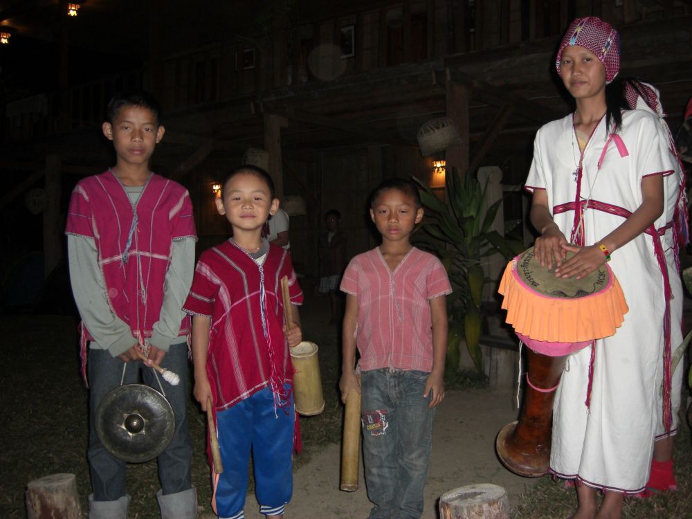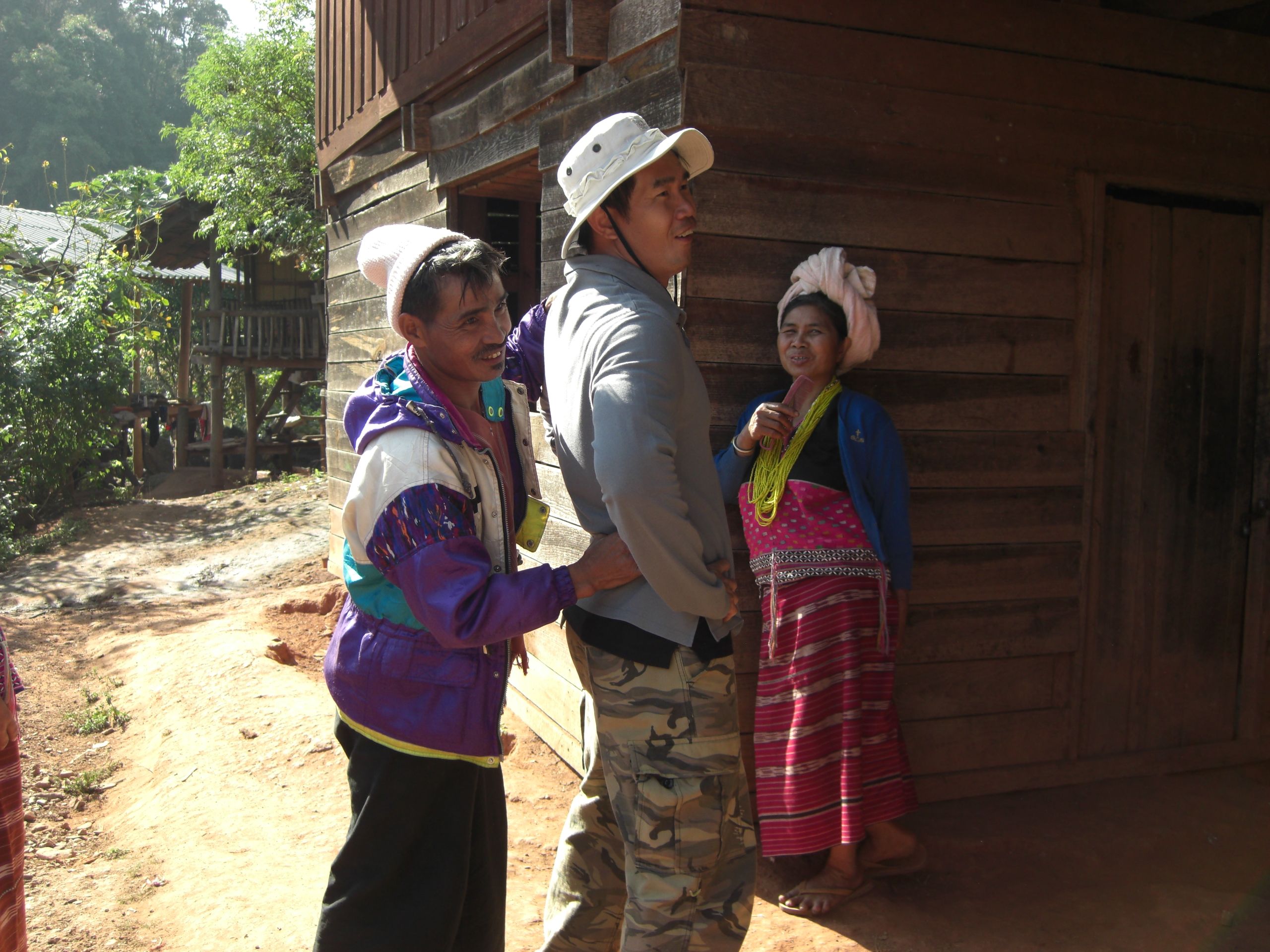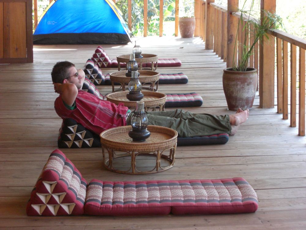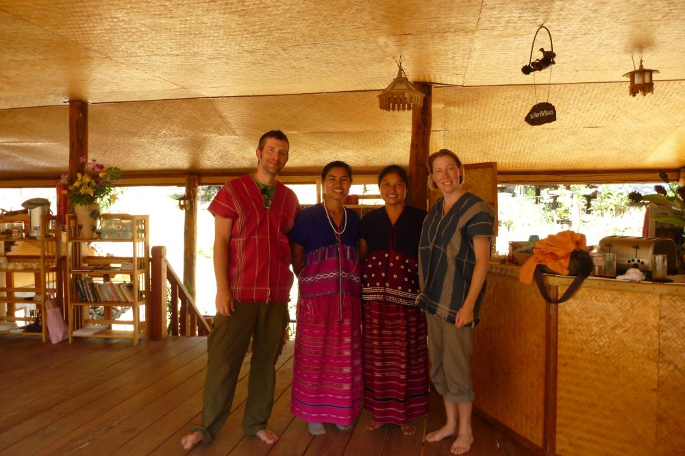 Eventually we retire to our room. It’s just a mattress on the floor, no electricity, but with enough blankets to keep us warm. I fall asleep smiling, the smell of pine and bonfire everywhere. In the morning they ask about our breakfast, assuming we’d like it Western-style, but we’d rather have what they’re having. The owner eats with us, a nice man from Scotland who married a Thai woman and started this business to help the local people keep their traditions alive. He says most of the kids had stopped wearing traditional clothes and learning the music of the region, but he helped turn that around. We’re glad to be part of it. He also tells us that he’s been seeing a group of gibbons coming through the trees on a regular basis, which haven’t been seen in this region for a very long time. He’s hung food like bananas from the trees to encourage them to keep coming. This morning he has his telescope ready to show us, and we can hear their calls within the forest nearby, but cannot locate them visually.