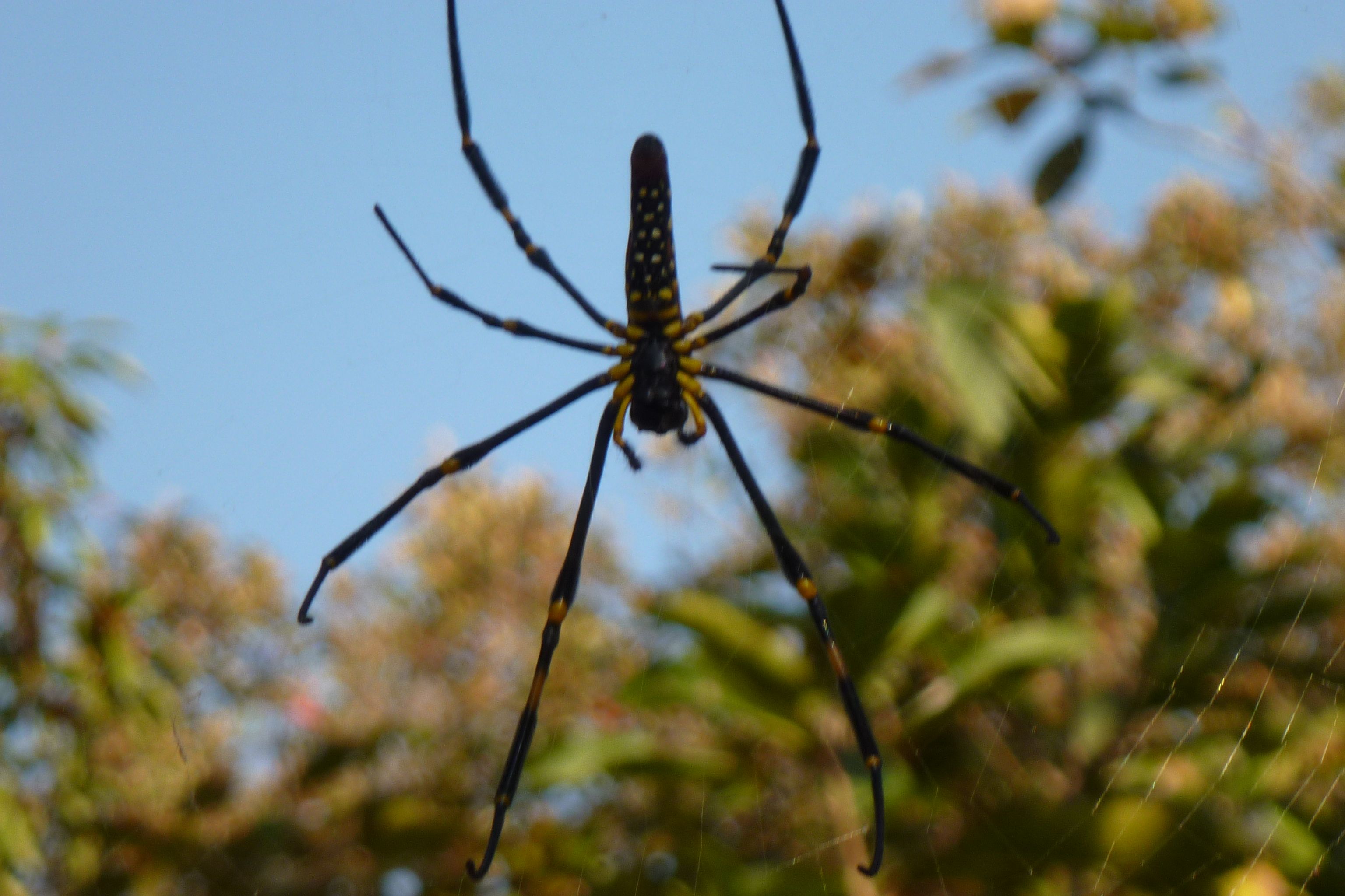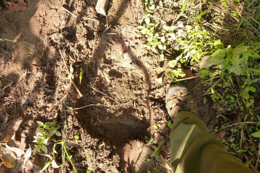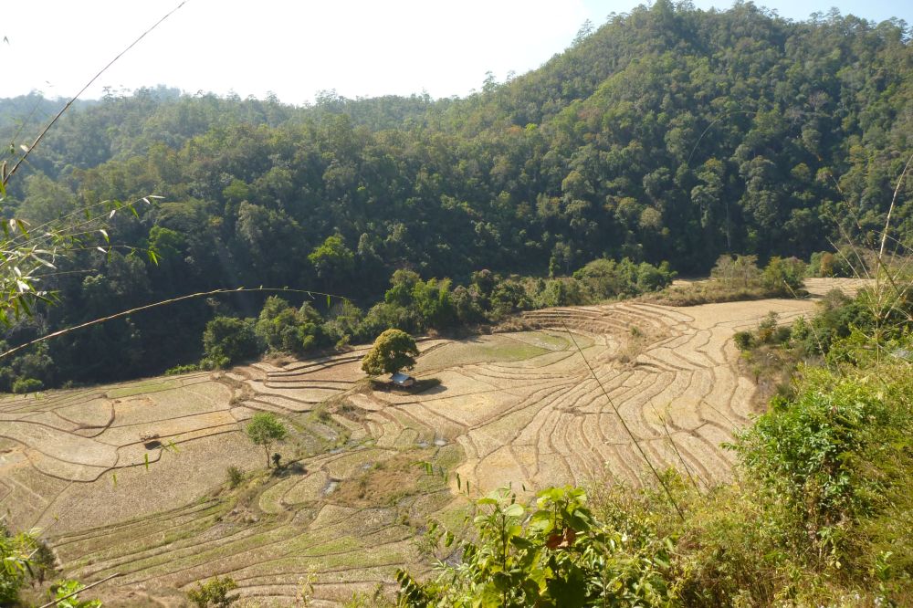 The next morning we set out for an hour and a half of trekking. Our driver takes the vehicle ahead of us, and our guide Soiphet, who has only done this trek once before, gets another local guide to help us stay on track. (He does correct a couple of wrong turns.) We’re surprised at how many people are involved in this little tour for the 2 of us. We pass through rice paddy fields (dry this time of year) and see evidence of elephants passing through the forest — mainly downed trees and dung. Our guides point out plants & things along the way.