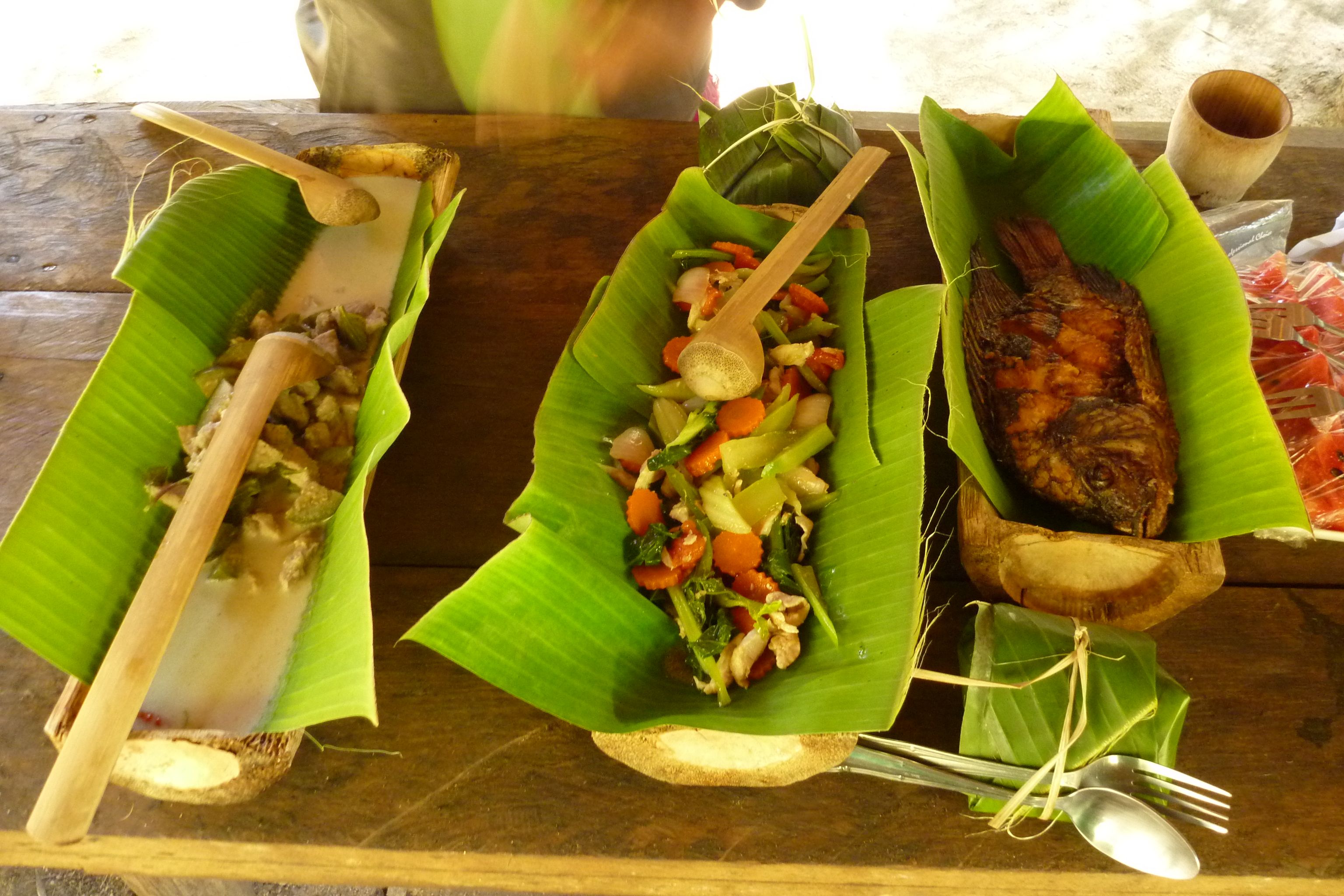 We stop for lunch at a pretty spot in the river. Our driver is already there, and has hot tea for us to drink out of a piece of bamboo that he says he carved himself and can only be used once. There’s a group of people with him, preparing lunch. We feel a bit fussed over. They turn out a feast, very tasty and so beautiful.
