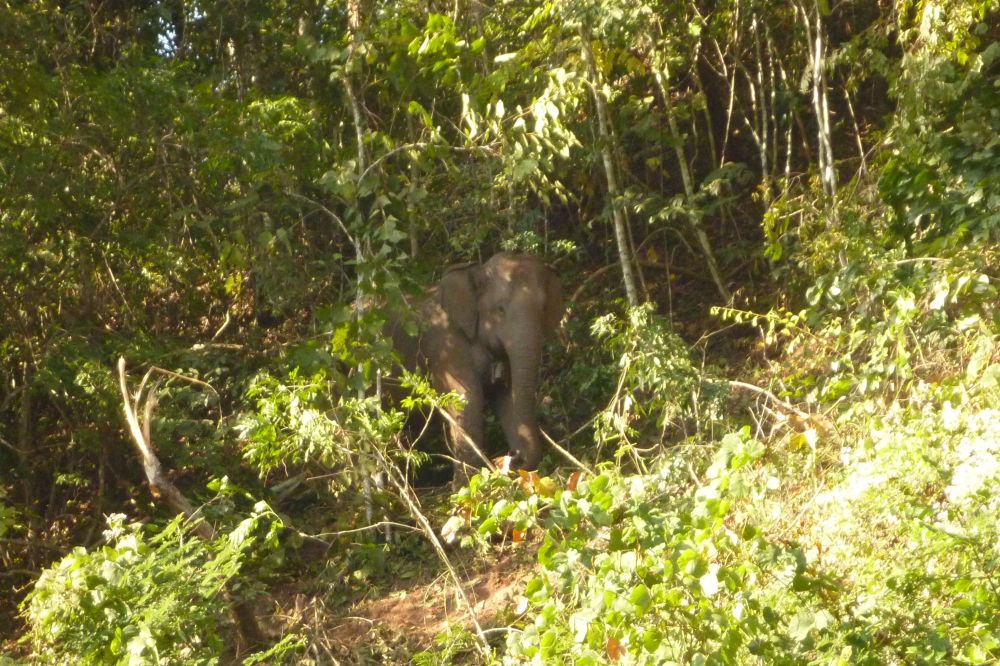 We say goodbye and head out with our 2 guides again for another hike while the driver takes our luggage ahead. We’re walking through the forest, and at one point we look up and see an elephant half-hidden in the trees, just watching us pass by. Surreal! It’s the same female elephant from yesterday. Soiphet says there are only the 2 in this area, owned by the Karen hill tribes for logging, transportation, and tourist purposes.