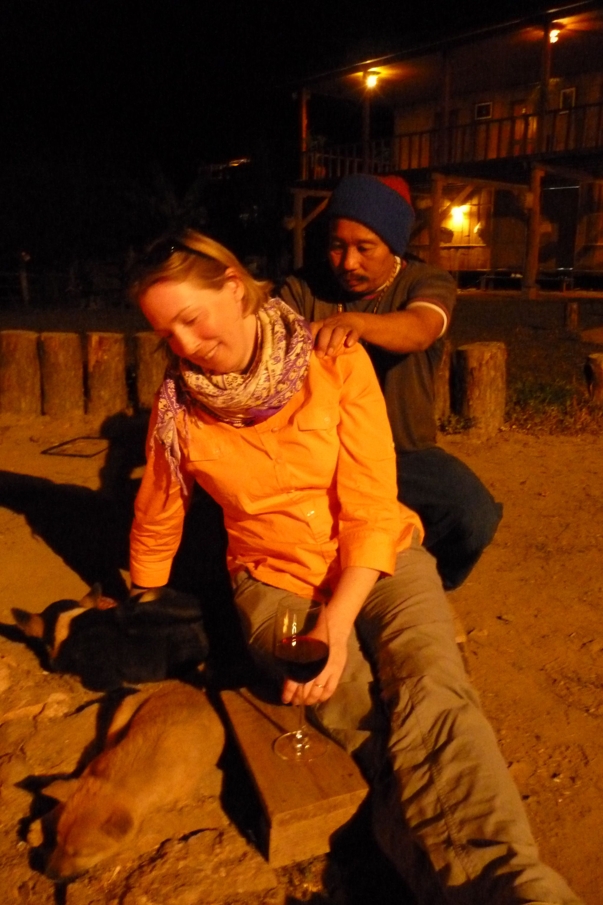 Everyone hangs out by the fire, eating, drinking, and laughing. What a perfect day. I’m sitting by the fire, two puppies curled up with me, drinking wine and getting a back massage. This might be heaven.