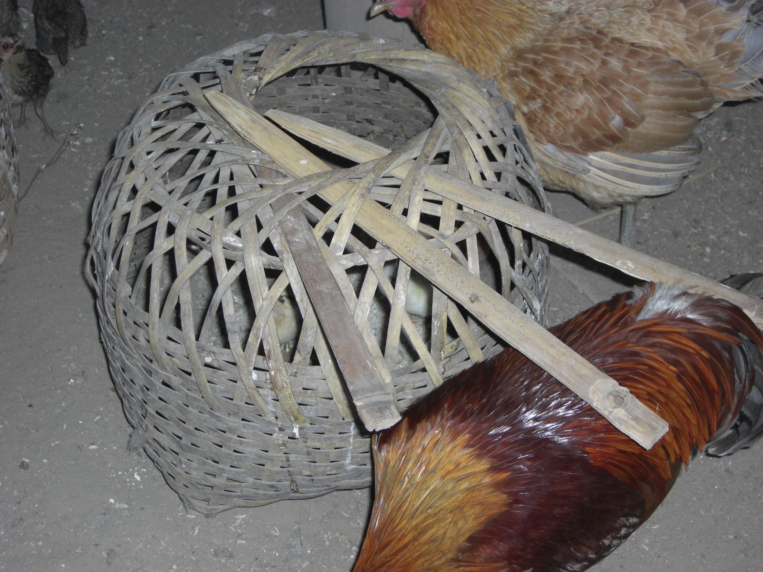 Here, a woman shows me how to gather up chicks to protect them from mongoose attacks at night. Catching a chick is not easy. She grabs them, firm and fast, and pops them inside this little basket. Poof.