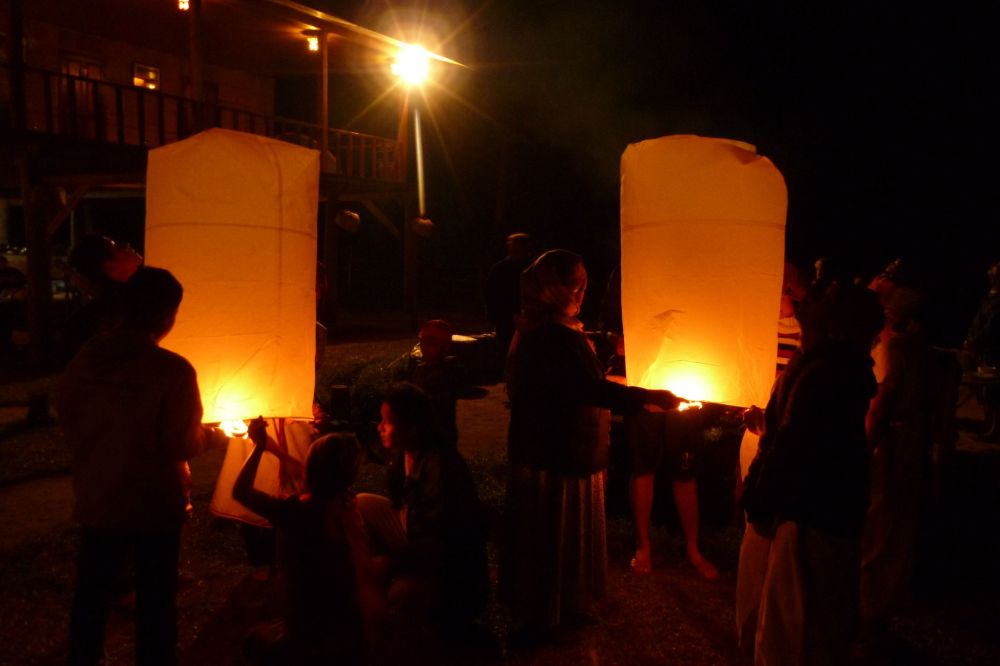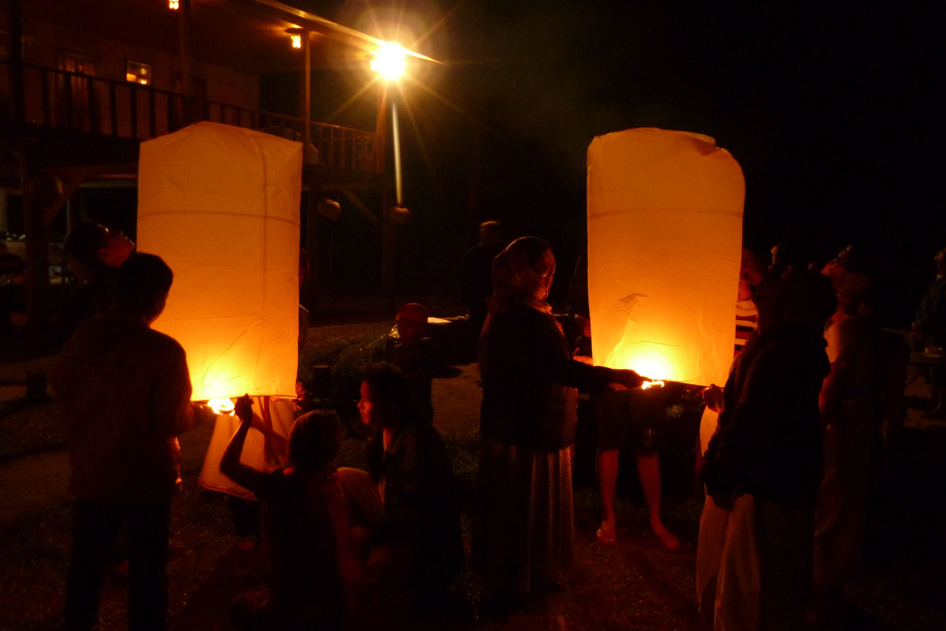 There are paper lanterns for everyone to launch. We watch them head up, up, up until they disappear.
