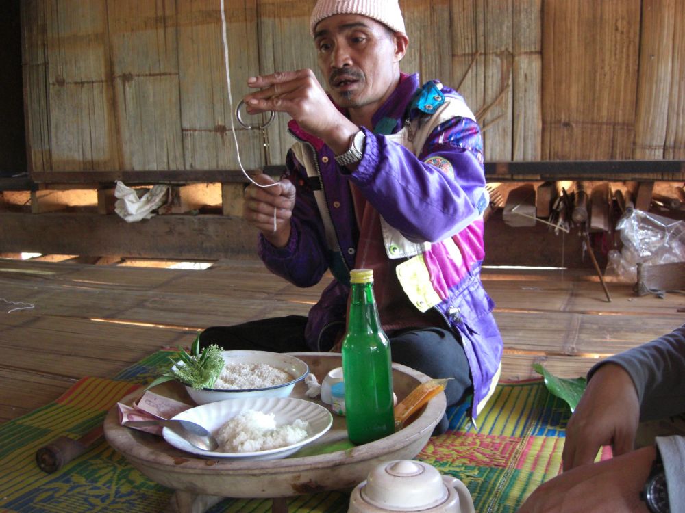 We enter a village (I like to call it You), where Soiphet introduces us to the village shaman. We are escorted into his house, no shoes allowed of course, and sit on the floor across from him. He offers us some water, and also some rice wine. We sip politely, and he motions to drink more. Soiphet nods to us. We say a little prayer and shoot them down, hoping we’re done, but the shaman refills them. Then he begins a ceremony. It’s unclear whether this ceremony is a welcome blessing, or a cleansing to protect his village from evil spirits we might be carrying in. It involves a piece of metal hanging from a string that he winds up tightly and pushes back and forth. He uses more strings, placing them in our hands, on our shoulders, mumbling things the whole time. He uncovers a hard-boiled egg, which I hope is just a prop. He blows on it and mumbles something. The egg goes into the dried rice and is ceremoniously moved around the bowl. Candles are lit. More strings, more mumbling. Suddenly the metal piece falls from the string that has been wobbling and swaying overhead. I must have jumped a foot. He peels the hard-boiled egg, breaks it in half, and offers it to us to eat along with some cooked rice. There are lots of witnesses — men of the village circled around our small circle, watching us. We’re not feeling threatened or anything, maybe just a little uneasy. Out of respect for the local traditions, we do whatever we’re told.