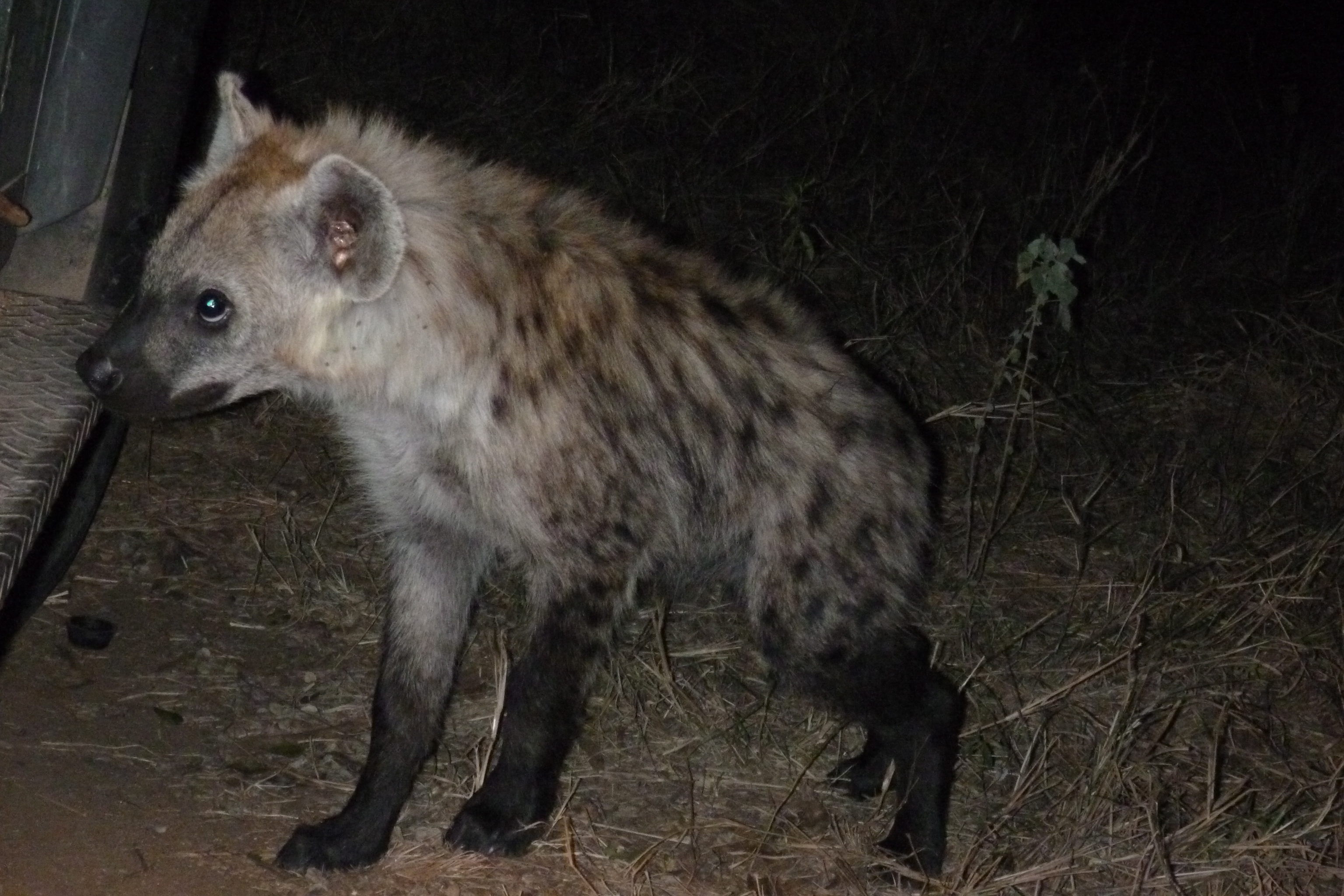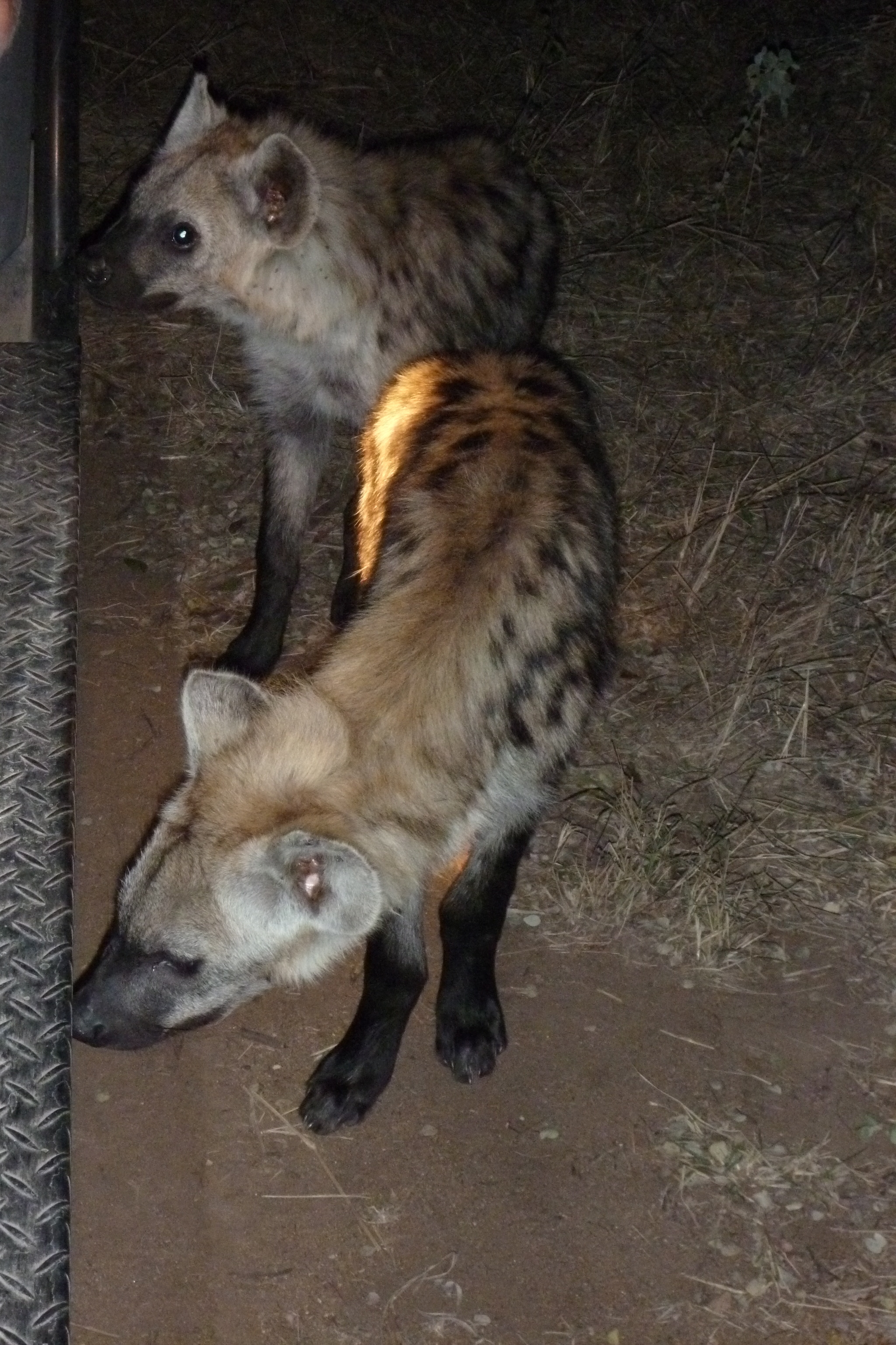 After the sun set, Gary asked us if we’d like to take a long trip across the reserve to go check out a hyena den he knew of. Having had our fill of lions and leopards for awhile, we said sure. It was a long detour, but well worth it. We had the place to ourselves, not coming across another single vehicle the whole evening. The adult hyenas were out hunting, leaving their youngsters home alone. The little guys were cute—as long as we overlooked the fact that hyenas can easily rip your face off.