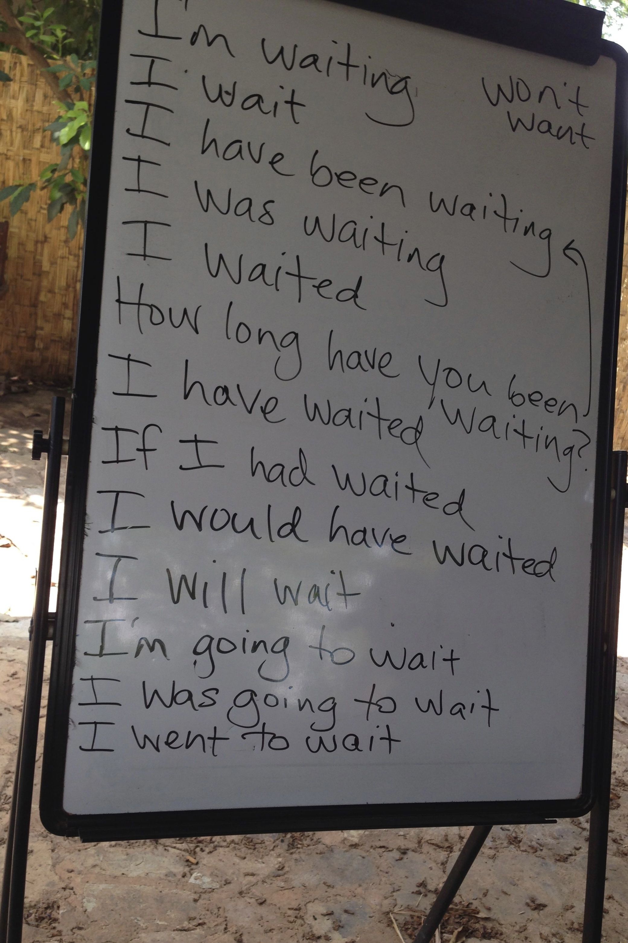 At the beginning, I didn’t have any materials or experience teaching English, so it was quite a challenge to come up with ideas and lesson plans. We went over the obvious things, like greetings and salutations, how to introduce yourself, your job, your family, basic verb conjugation, numbers, telling the time. Once we had named all the objects we could see around us, we took a walk around camp and named a few more. A friend donated some children’s books in French & English (the French is necessary so that they can double-check their understanding or get help with unfamiliar words). We studied those for a while, leading up to this funny story about Little Red Riding Hood. But generally I was hurting for ideas.