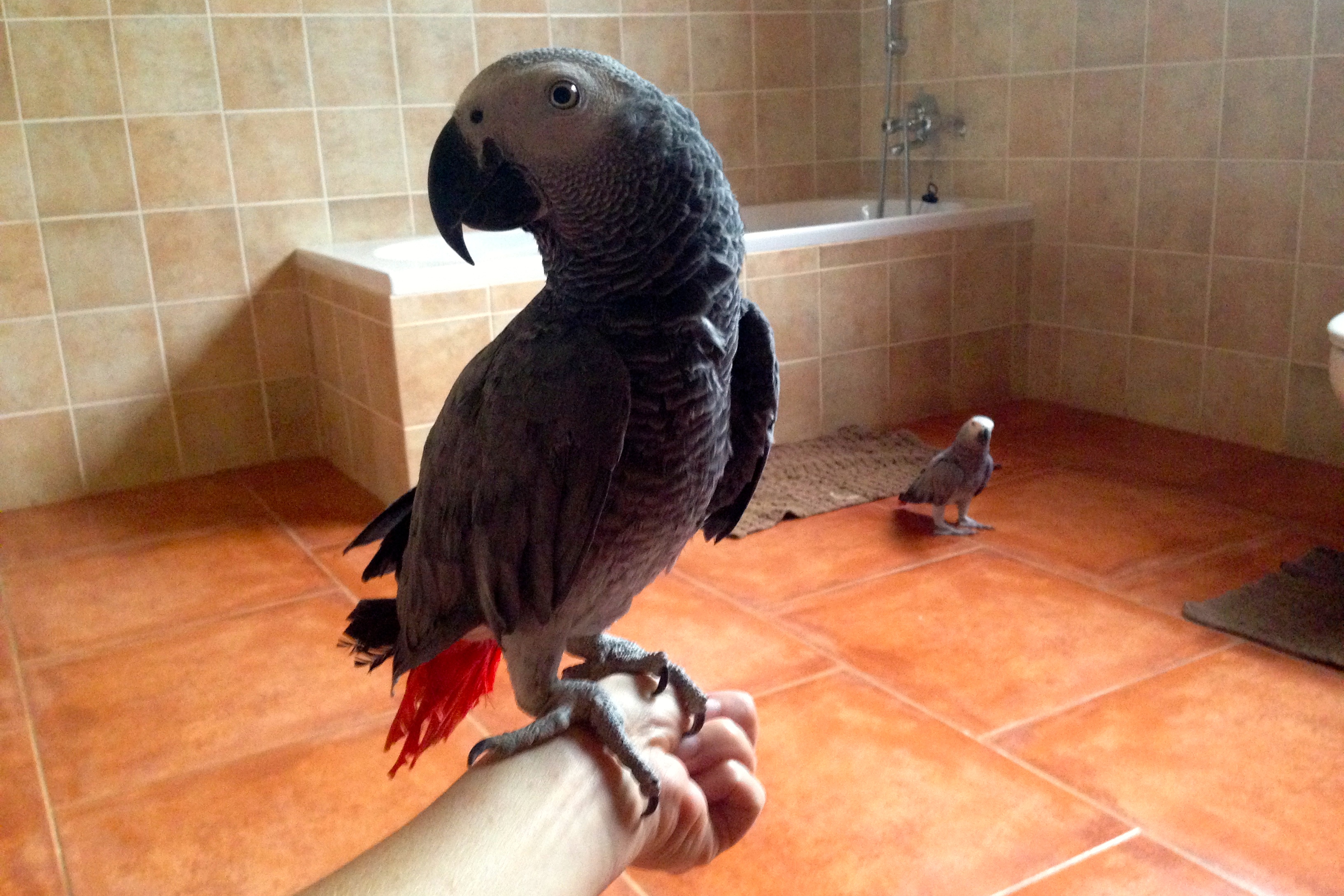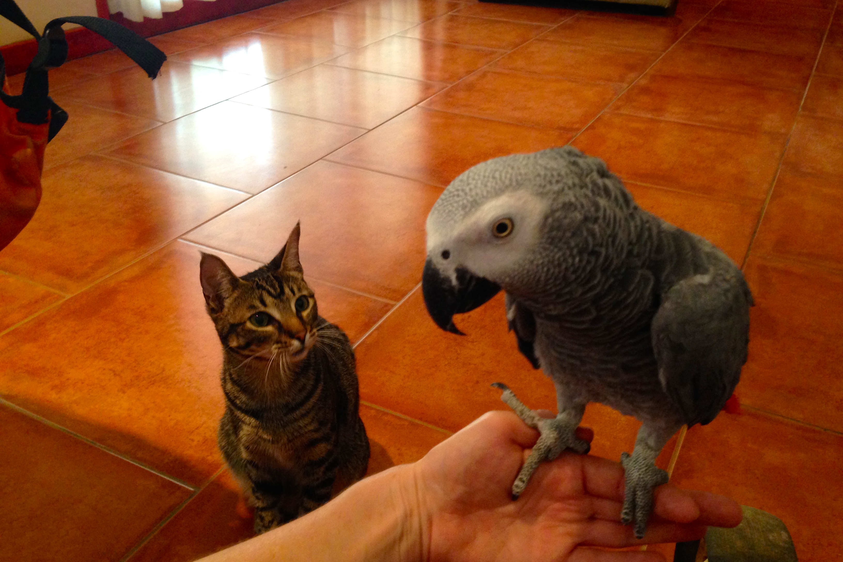 (November) Babysitting my neighbors’ African Grey Parrots Shaku & Kiji, who can say hello, Shaku’s name, and engage me in long whistling contests in the style of Simon Says
