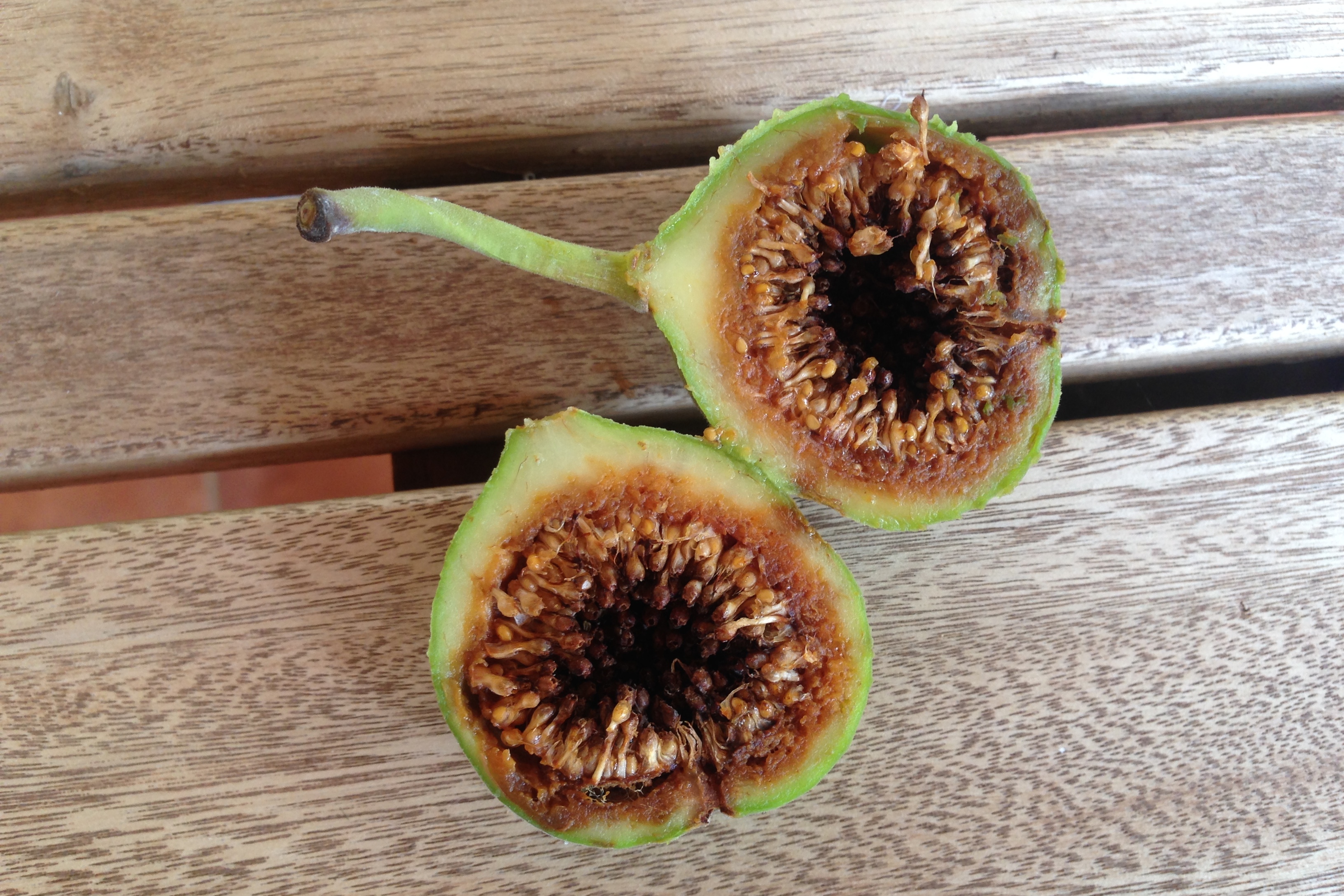 And the smell. It’s a smell I had subconsciously associated with this part of the year from seasons past. The smell of rotten figs is just as uncomfortable as the heat. They smell offensively heavy, like dirty laundry in a condensing dryer. They attract hordes of flies, and are covered with a fine, white substance that looks like mold or moss, which floats all over our patio and makes us sneeze.