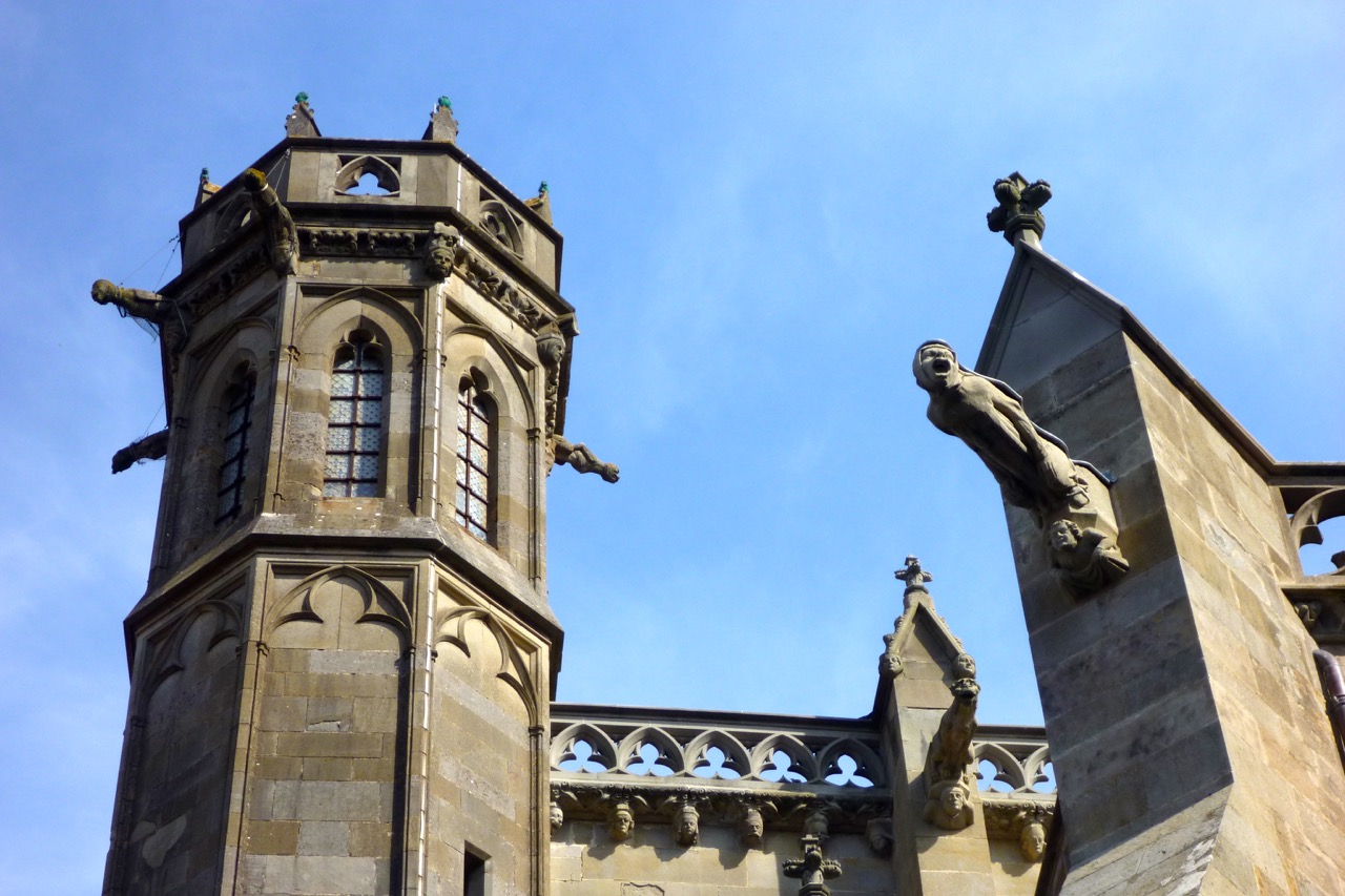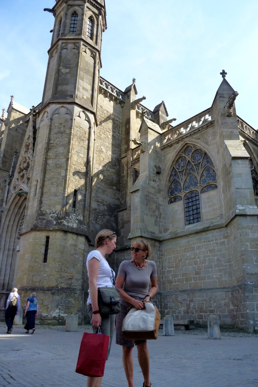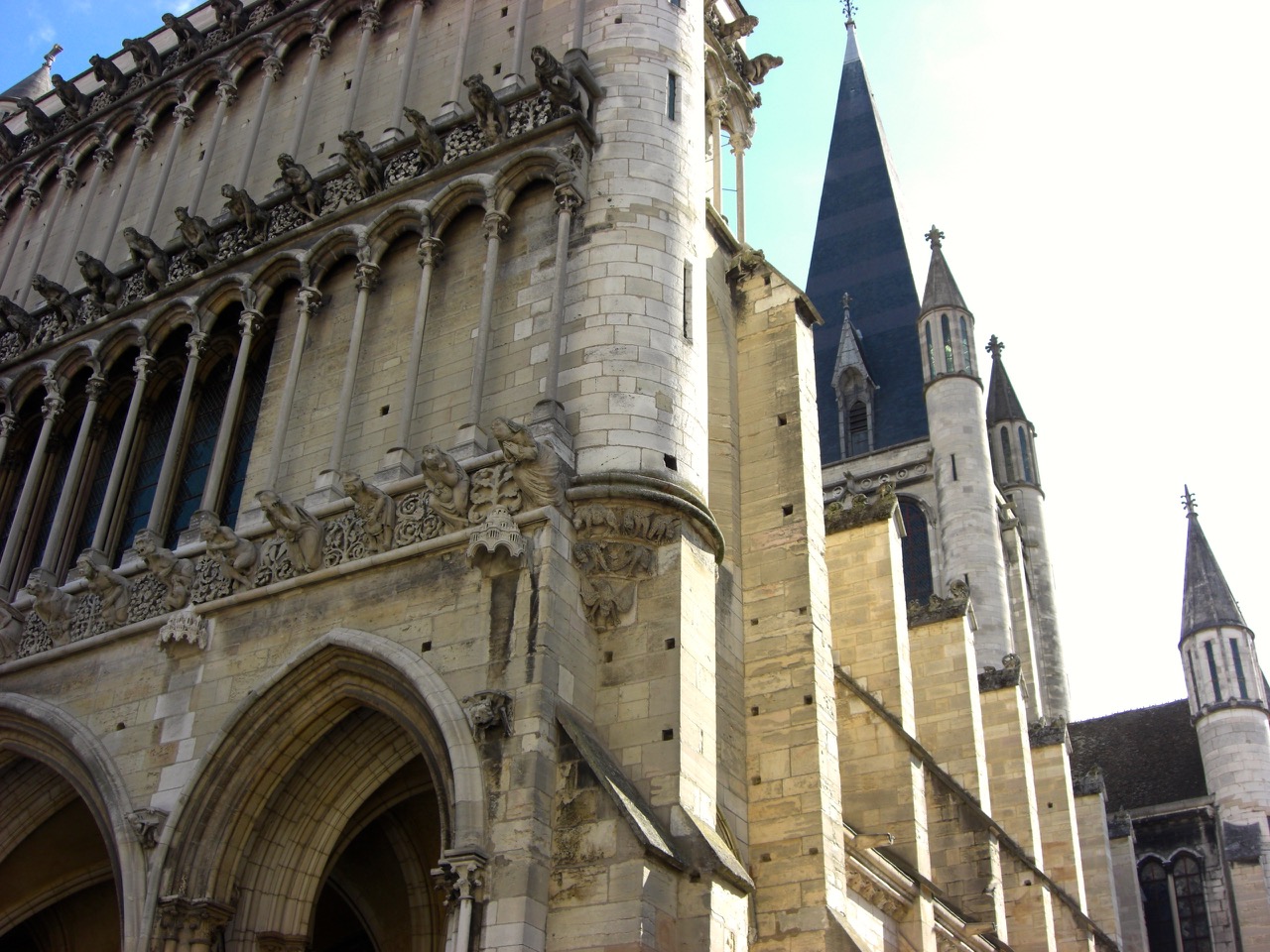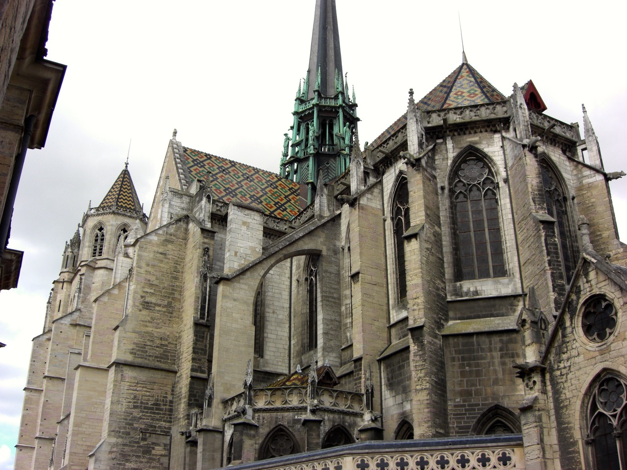 Next up, Dijon. Yes, the mustard capital of France. We only spent a couple of hours there for lunch, so I’m not 100% clear on what’s what, but from my internet research I think I was impressed by two different churches. First, the Notre-Dame de Dijon, known for its spirited gargoyles. One which represented a loan shark “coincidentally” fell and killed an unlucky groomsman standing below, who also happened to be a loan shark. (However, since this story dates from the year 1240, I doubt snopes.com can tell me whether it’s true.) The second lovely church is the Saint Bénigne Cathedral with its colorful Burgundy-style roof. Both were built in the 13th century.