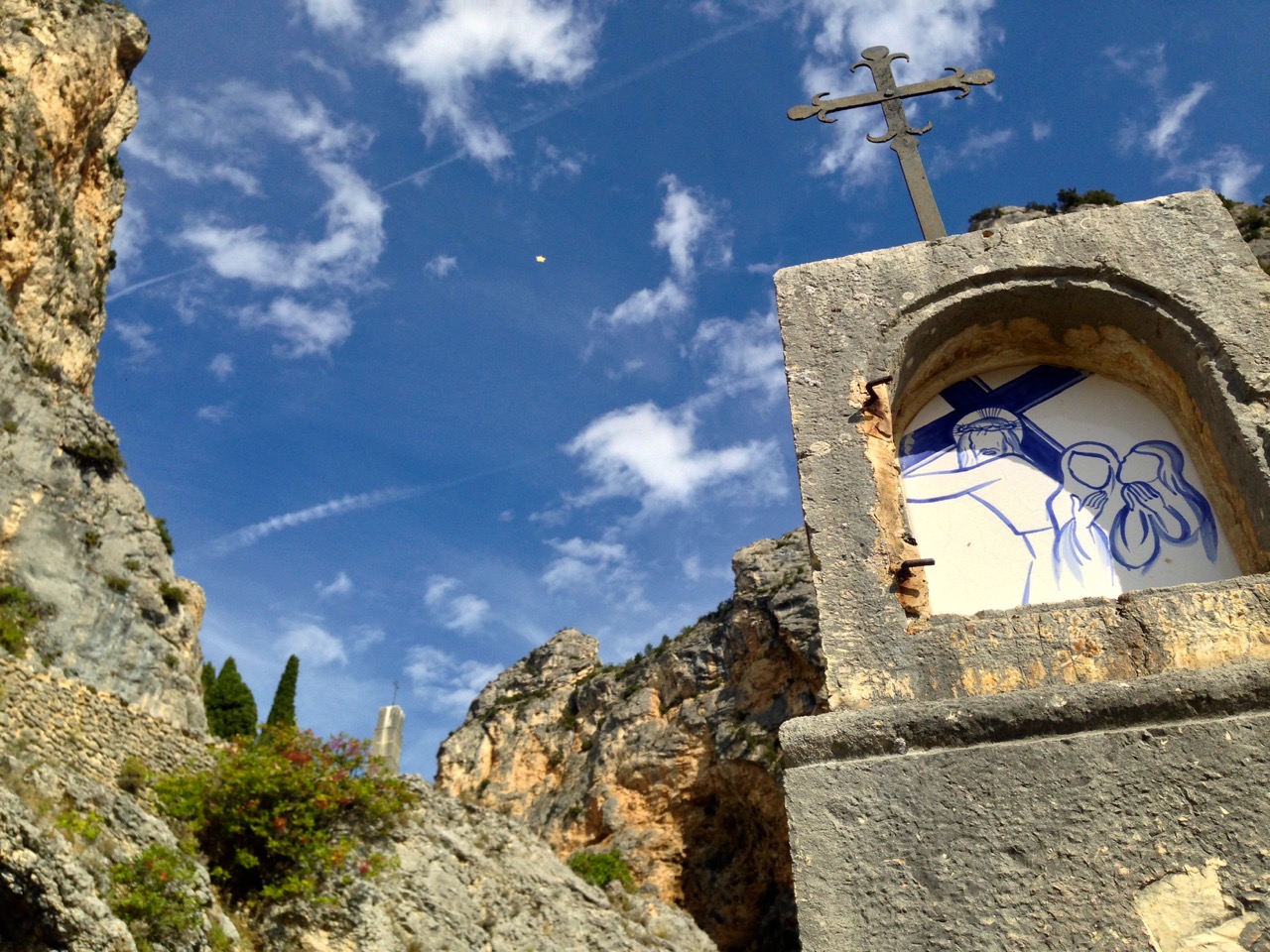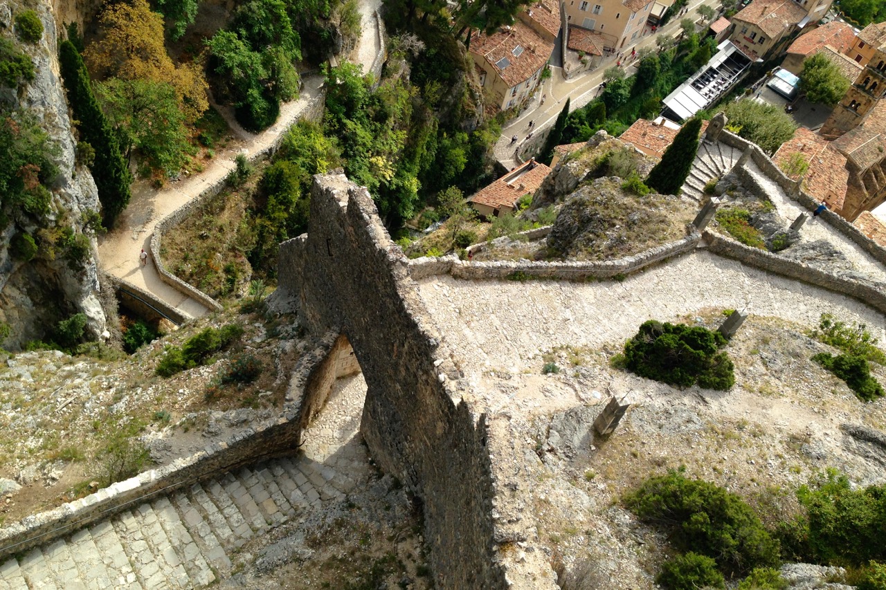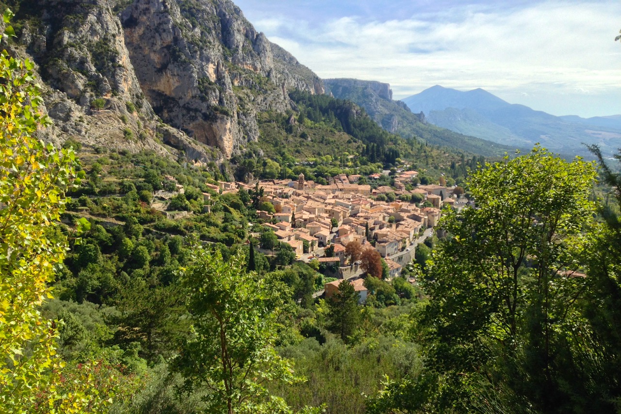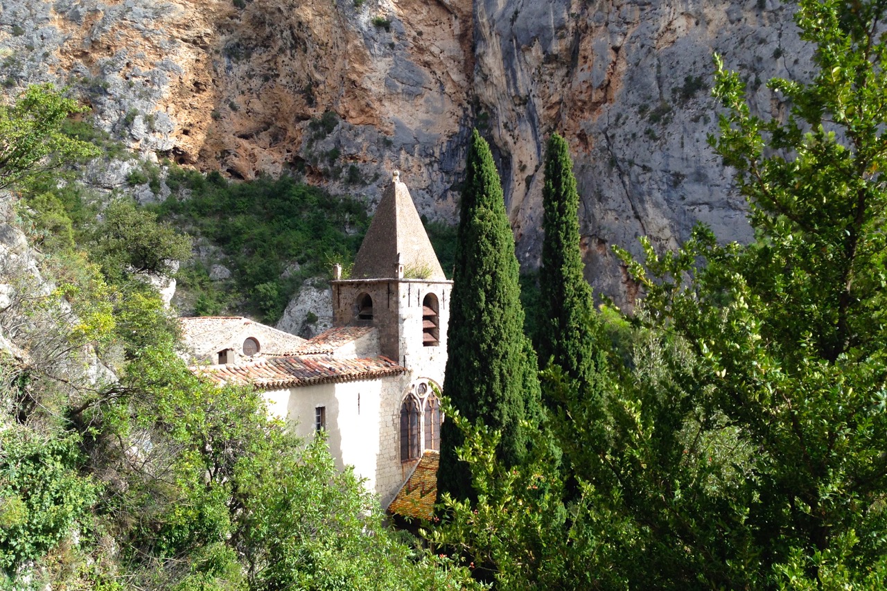 In the photo above you can see the 4-foot gold-painted star, one of the symbols of Moustiers. It’s hung on a 225-meter-long chain anchored on the two cliffs that tower over the perched town, and has been since the 10th century (though replaced several times). Legend has it that during the Crusades, a knight from this village was held prisoner by the Saracens. He prayed that if he ever made it home again, he would hang a gold star over his village.