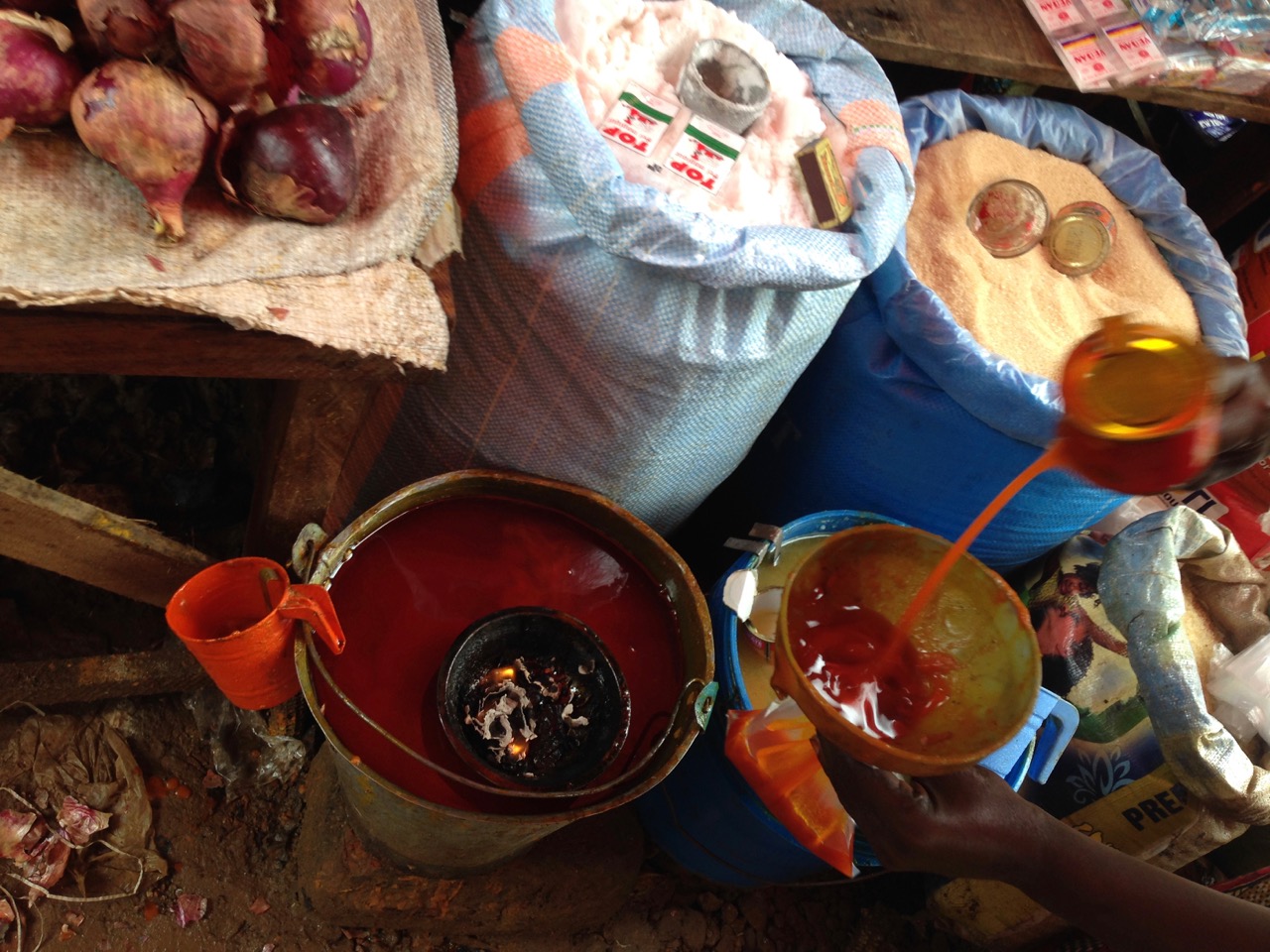 IMG_9323 Published on 25 February 2016 in Congo Cooking LessonsFull resolution (1280 × 960) ← Previous Next → buying palm oil at the local market. The candle keeps it in a liquid state. It’s measured in tomato paste cans and poured through a funnel into a plastic bag.